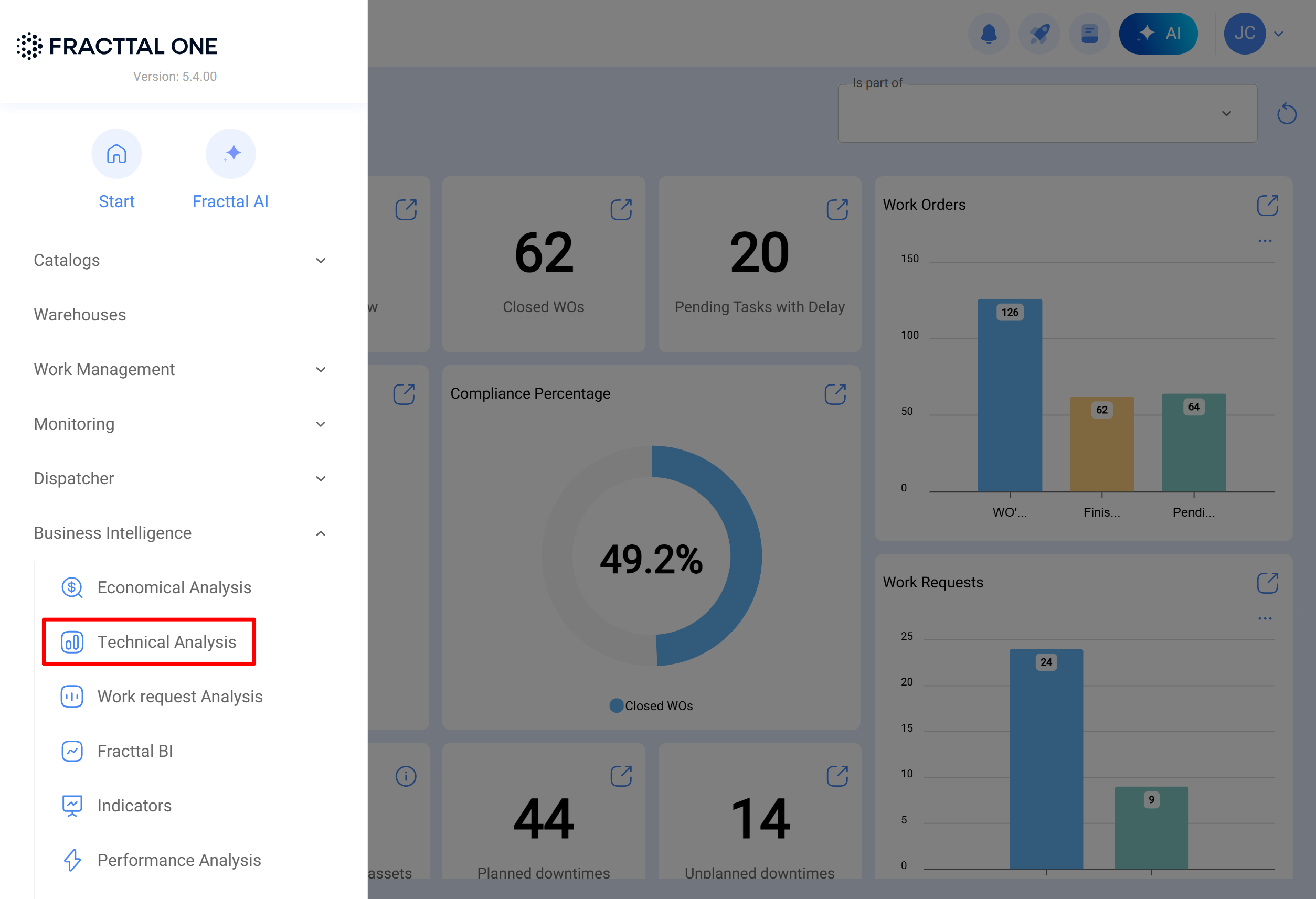 This module contains several charts that will allow you to analyze task completion, work orders (WOs), among other options that we will explain according to the submodule.