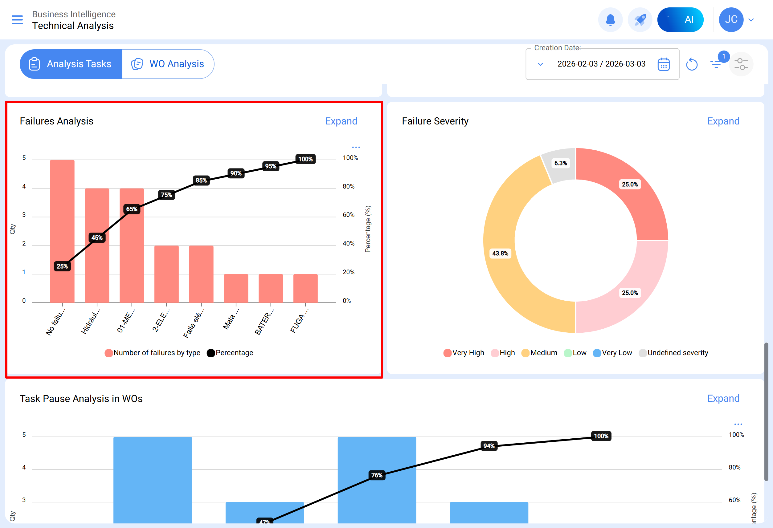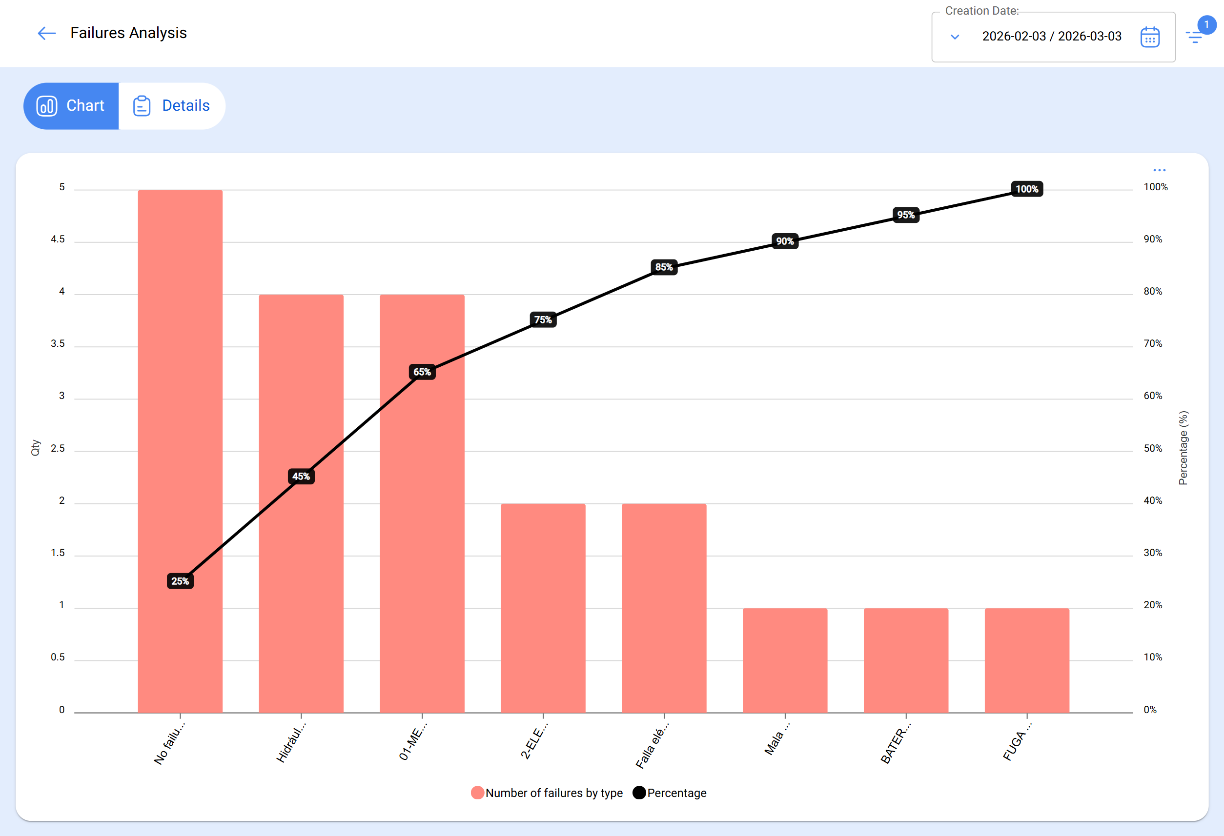 A bar chart that breaks down the main causes associated with each type of reported failure, allowing visual identification of the most frequent causes and their relationship with different types of failures. To view it, click on the bar of the type of failure you want to analyze.