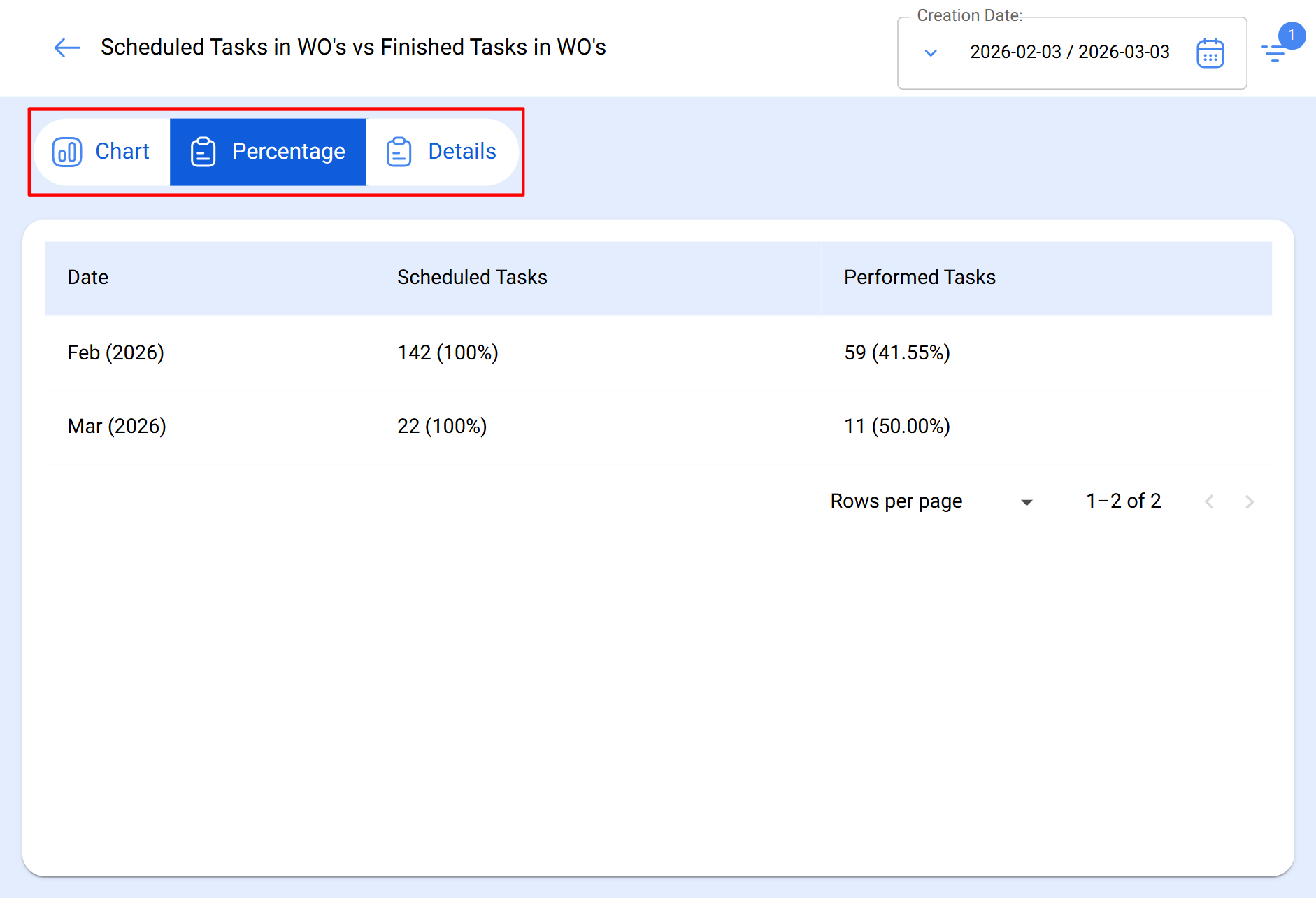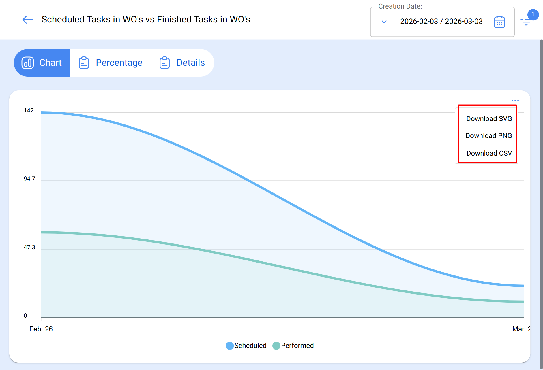 - Creation Date: The "Creation Date" in the charts refers to the moment when an element was initially generated or created, such as a work order, a task, or any other component. It is the timestamp indicating the start of the existence of that element.