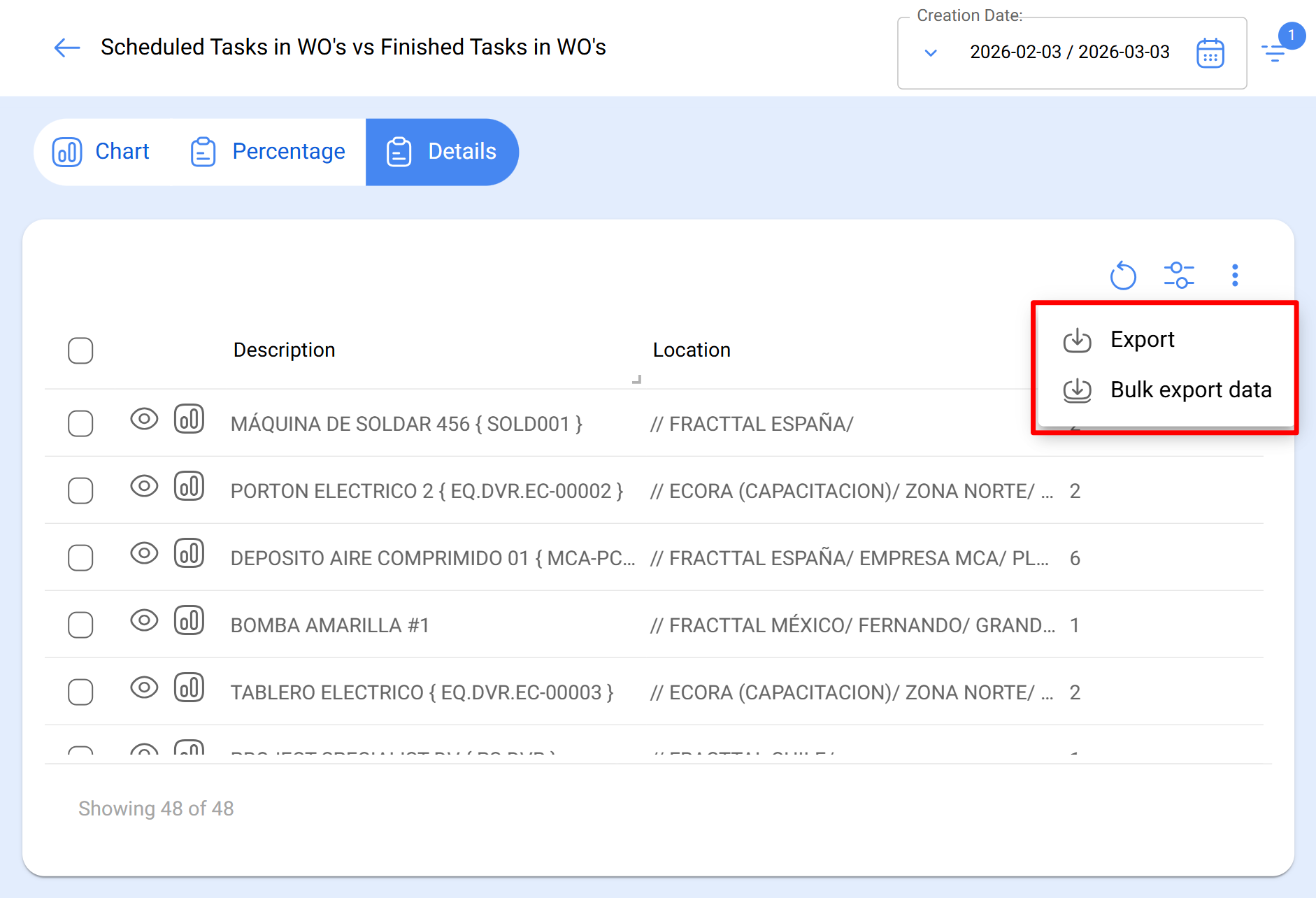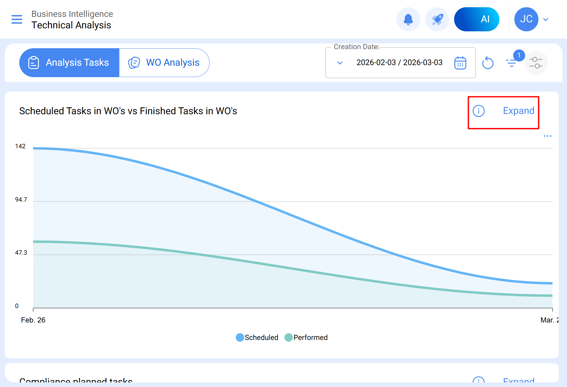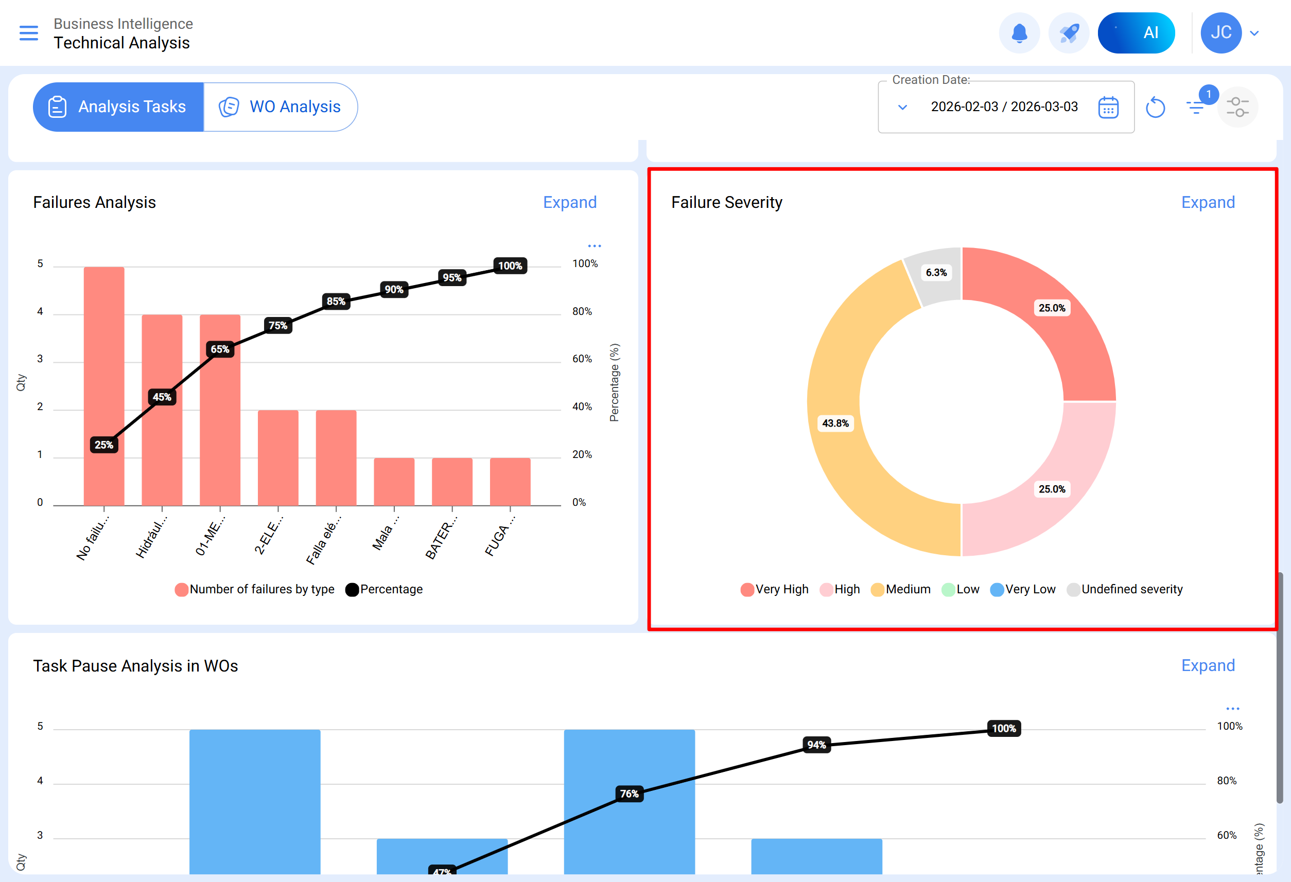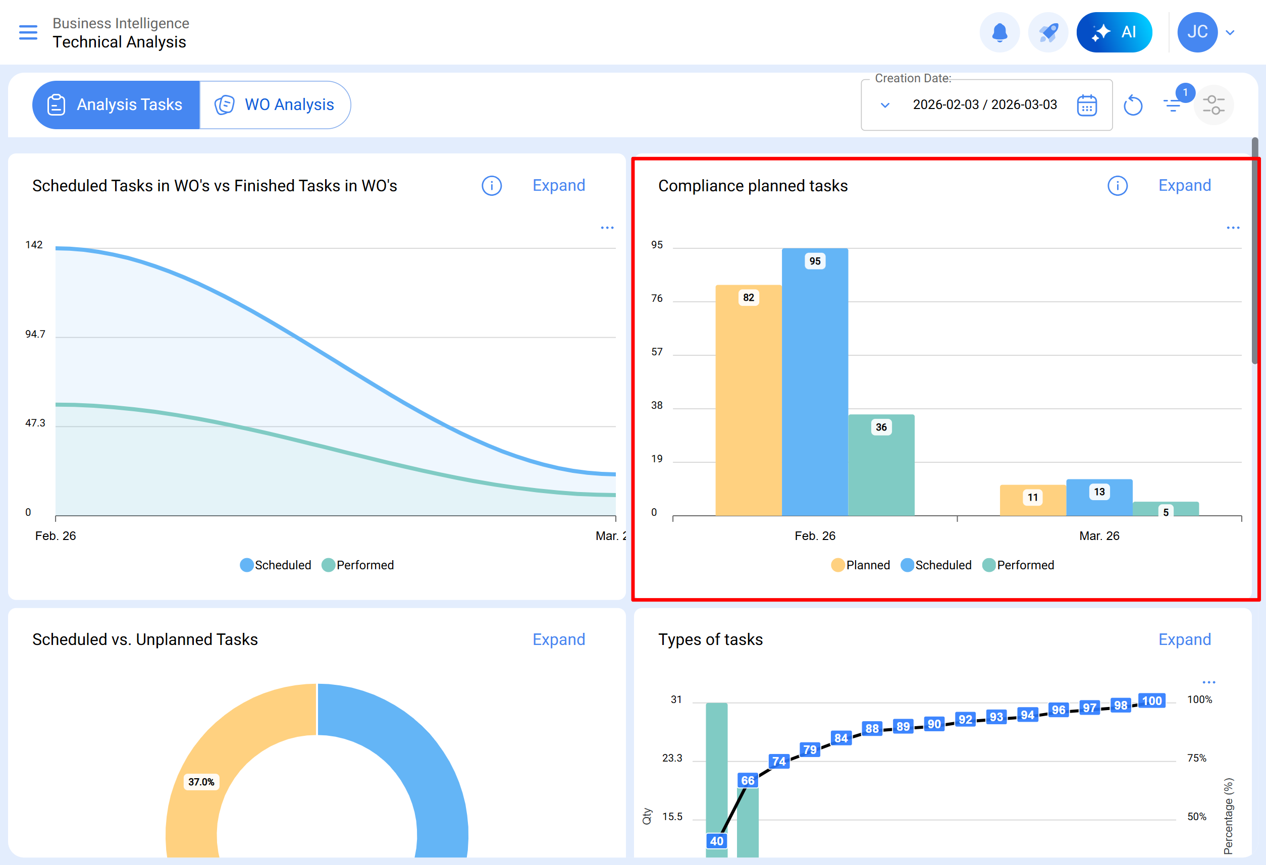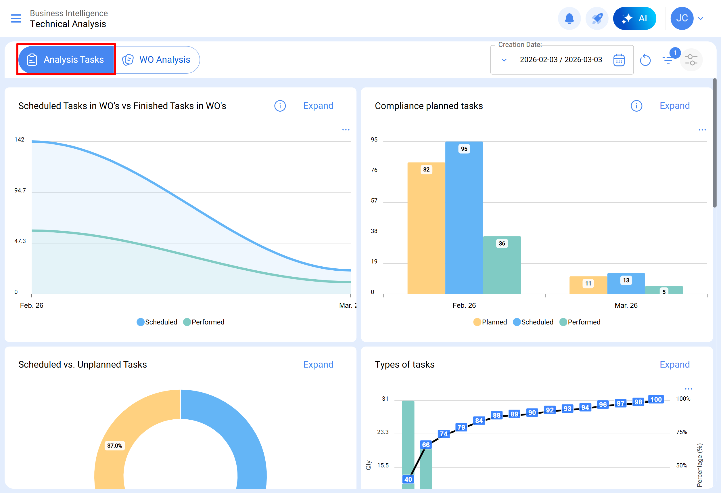 In this submodule, there are several charts that allow analyzing the completion of scheduled and completed tasks, compliance with planned tasks, planned vs unplanned tasks, types of tasks, task rescheduling analysis, task pause analysis in WOs, among other options that we will explain below: