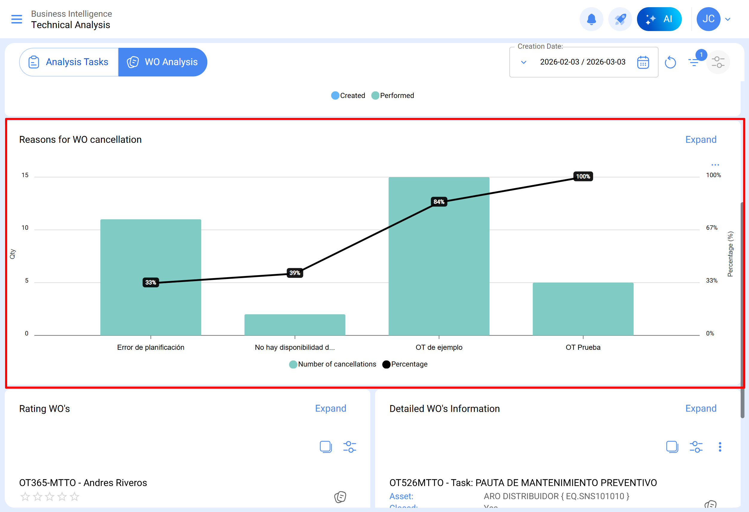 In the work order analysis submodule, various representative charts are used that, through precise analysis, allow making assertive medium- and long-term decisions. These charts include comparisons between scheduled tasks in WOs, completed tasks, created tasks, cancellation reasons, etc. It is crucial that the initially consolidated information contains keywords, avoiding repetitions and variations in definitions to maintain accuracy.