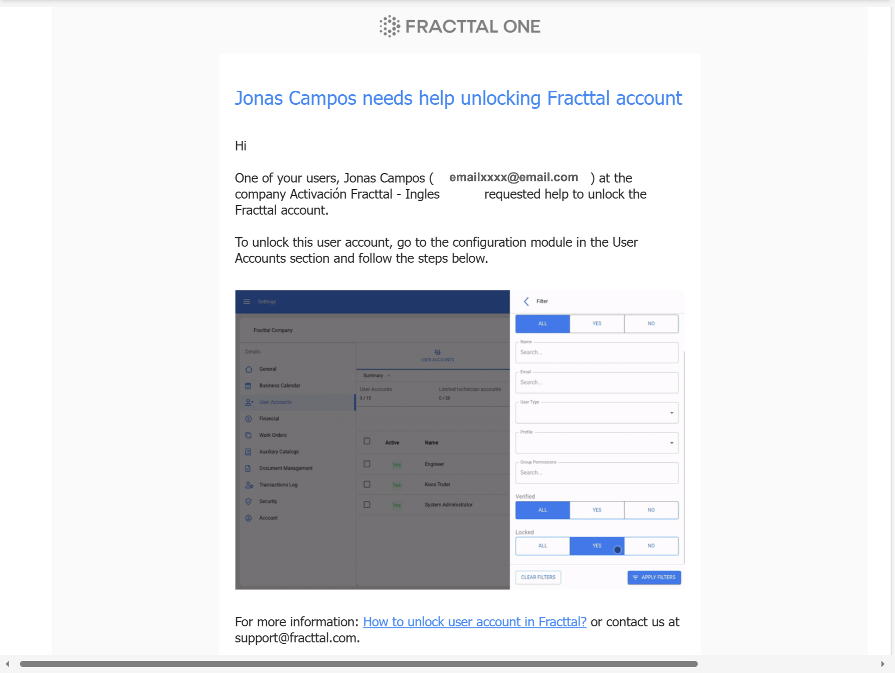 The second option to unlock an account is through the intervention of one of the designated administrators on your Fracttal One account. These administrators will receive an email with the following message: 'User needs help unlocking their Fracttal account', which will include a brief explanatory video detailing the step-by-step process.