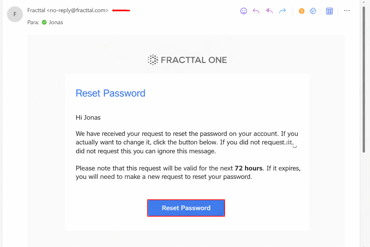 - Access your email inbox and locate a message sent from the address: no-reply@fracttal.com.