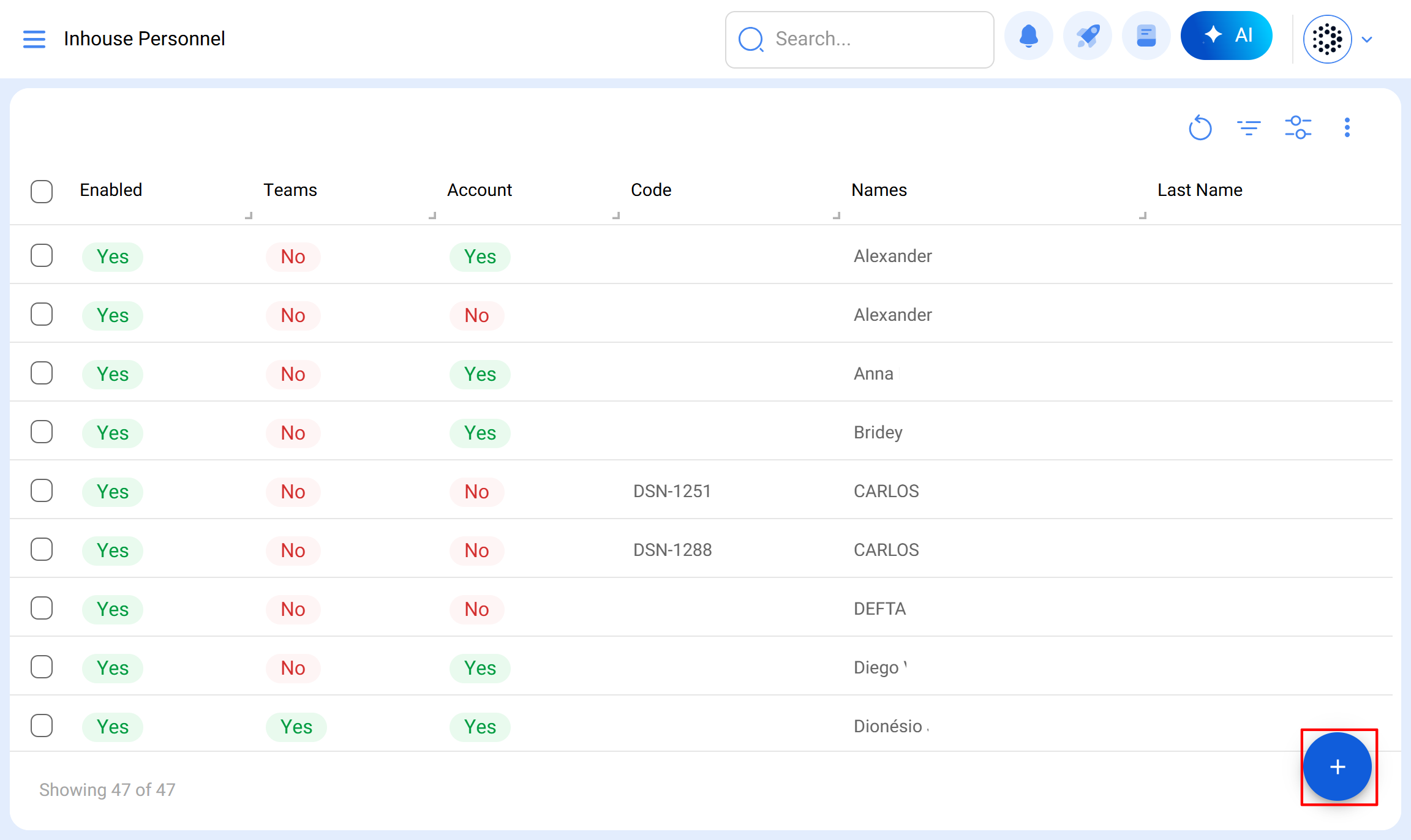 To add a human resource, simply click on the add symbol located at the bottom right of the platform.