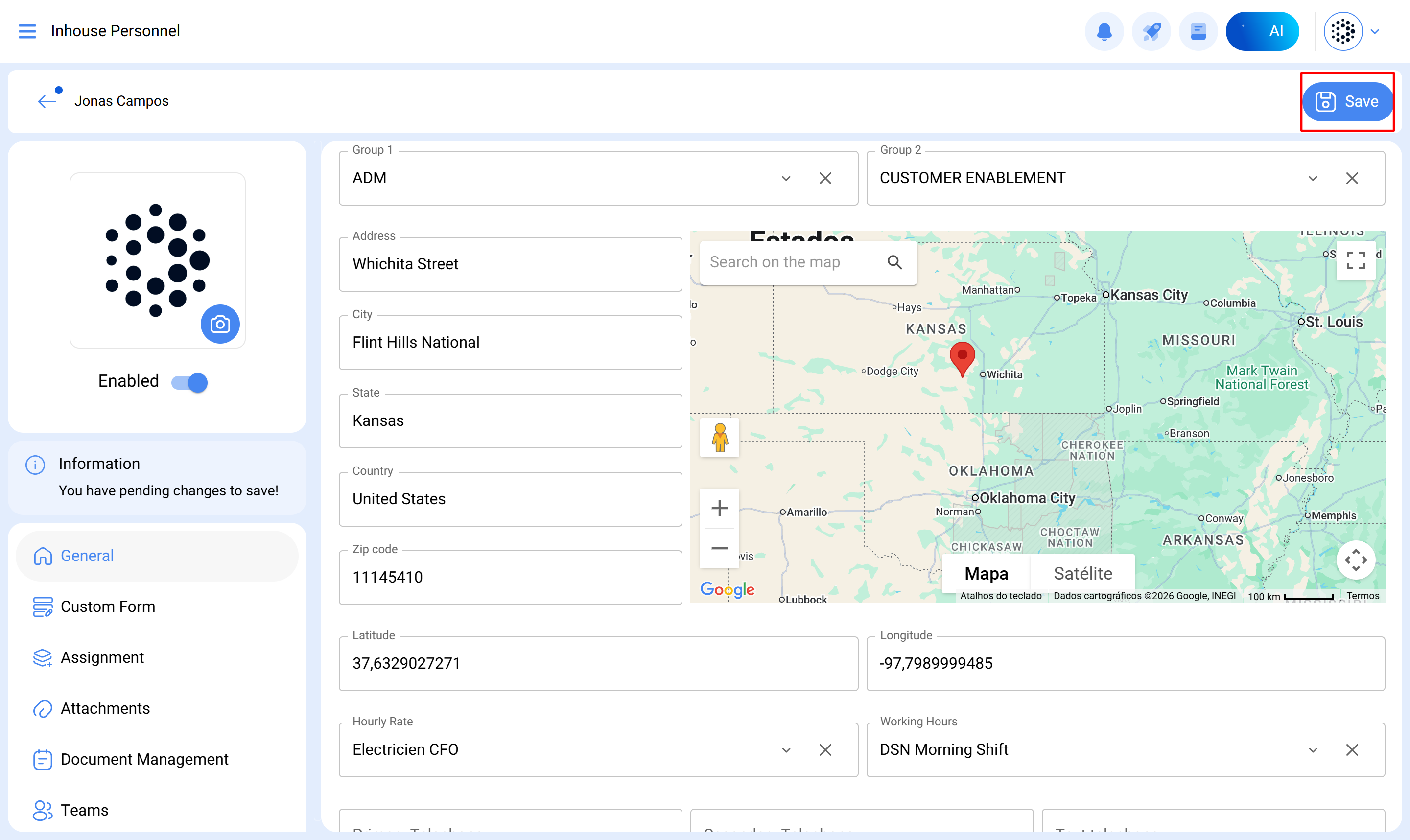 Latitude, Longitude: Fields that are automatically added when "Search on the map" is used for the address of the human resource.