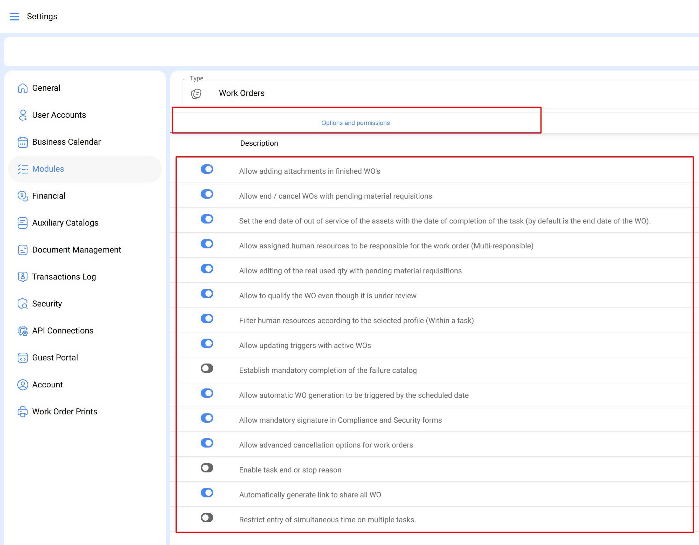 In this section, options and permissions for WOs can be configured: