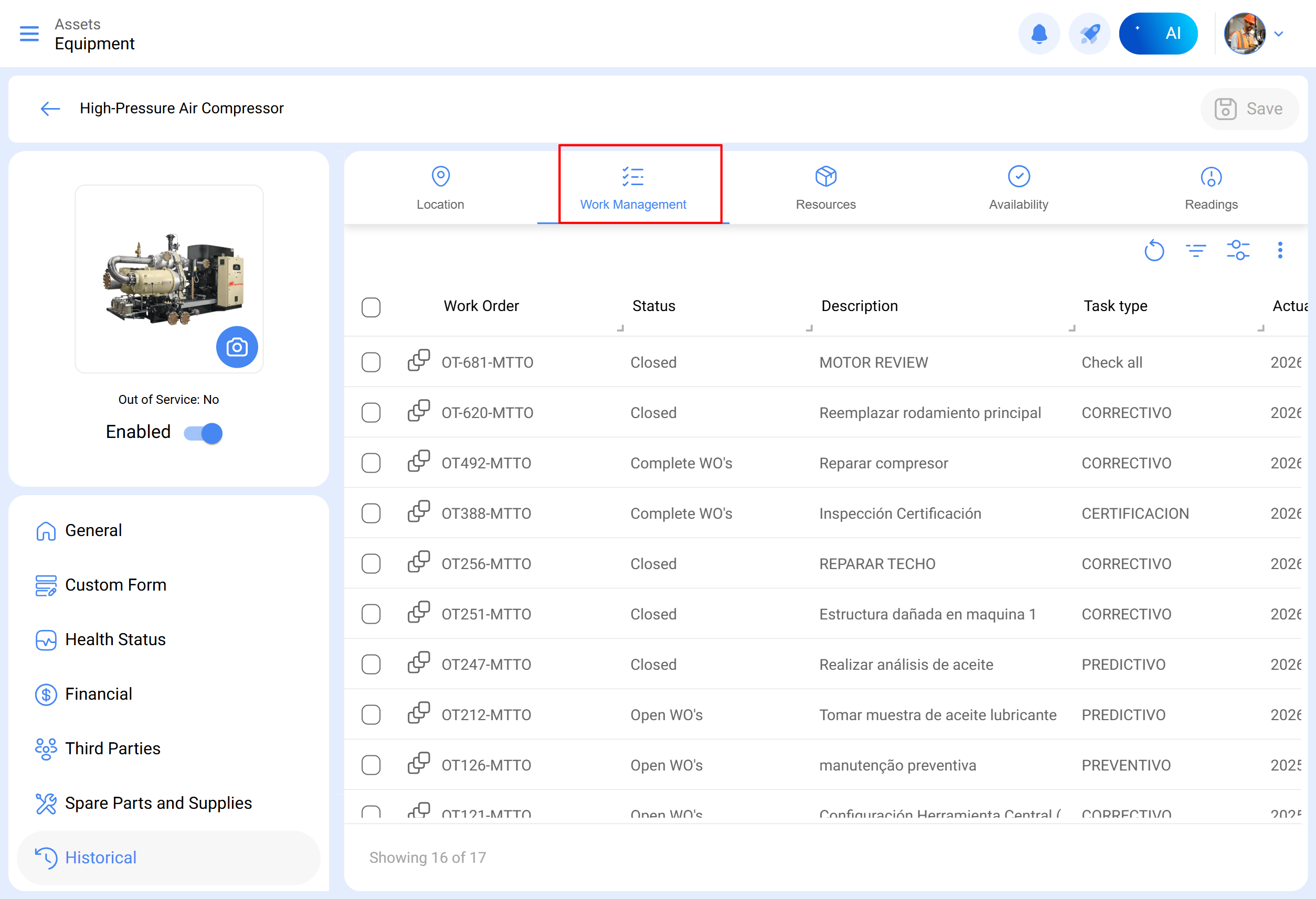 In this section, within the asset view, you will find an option that allows you to access a historical record of different activities related to a specific asset. These activities include location movements, assigned tasks, resources used, equipment availability, and historical readings.