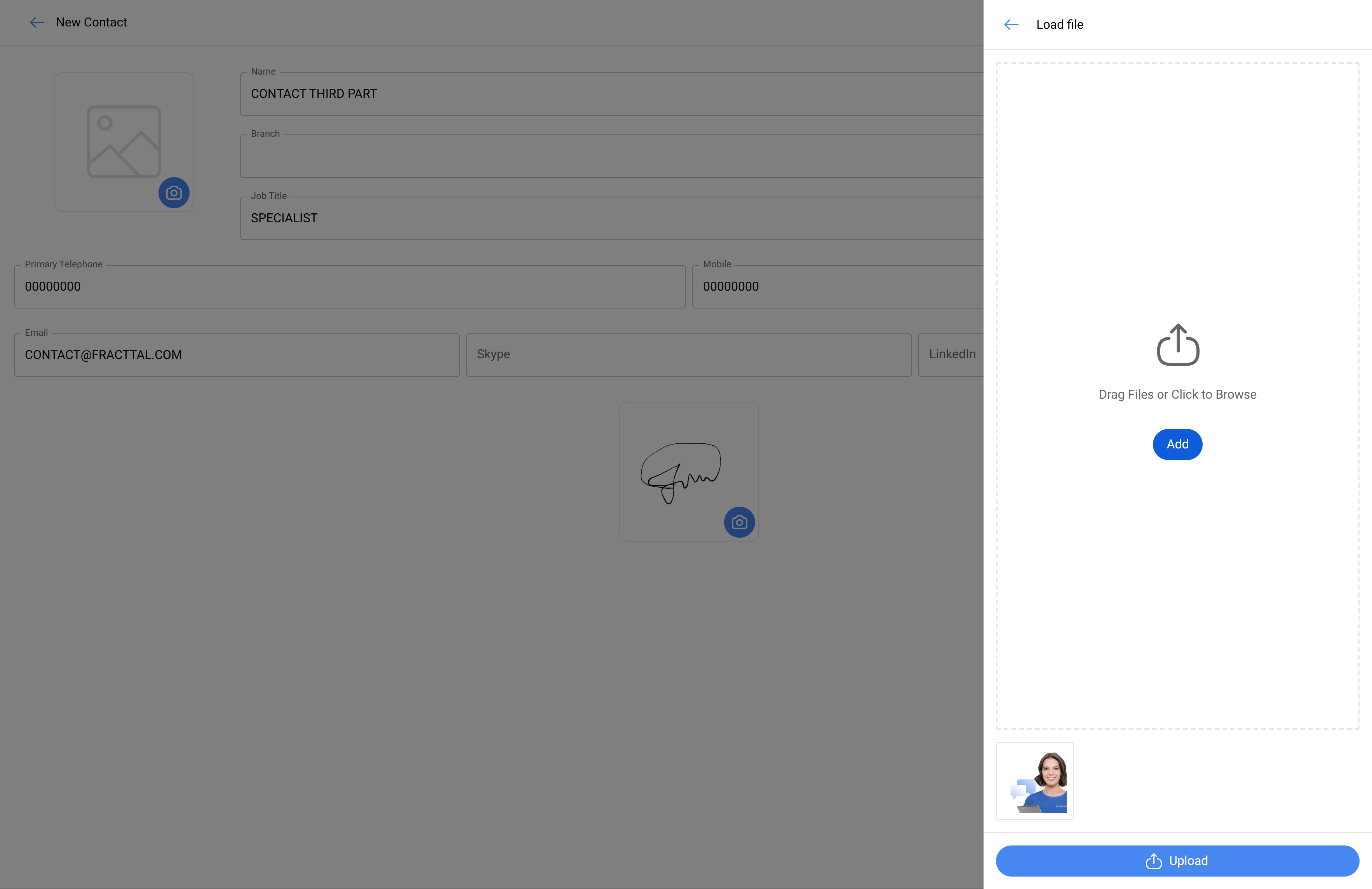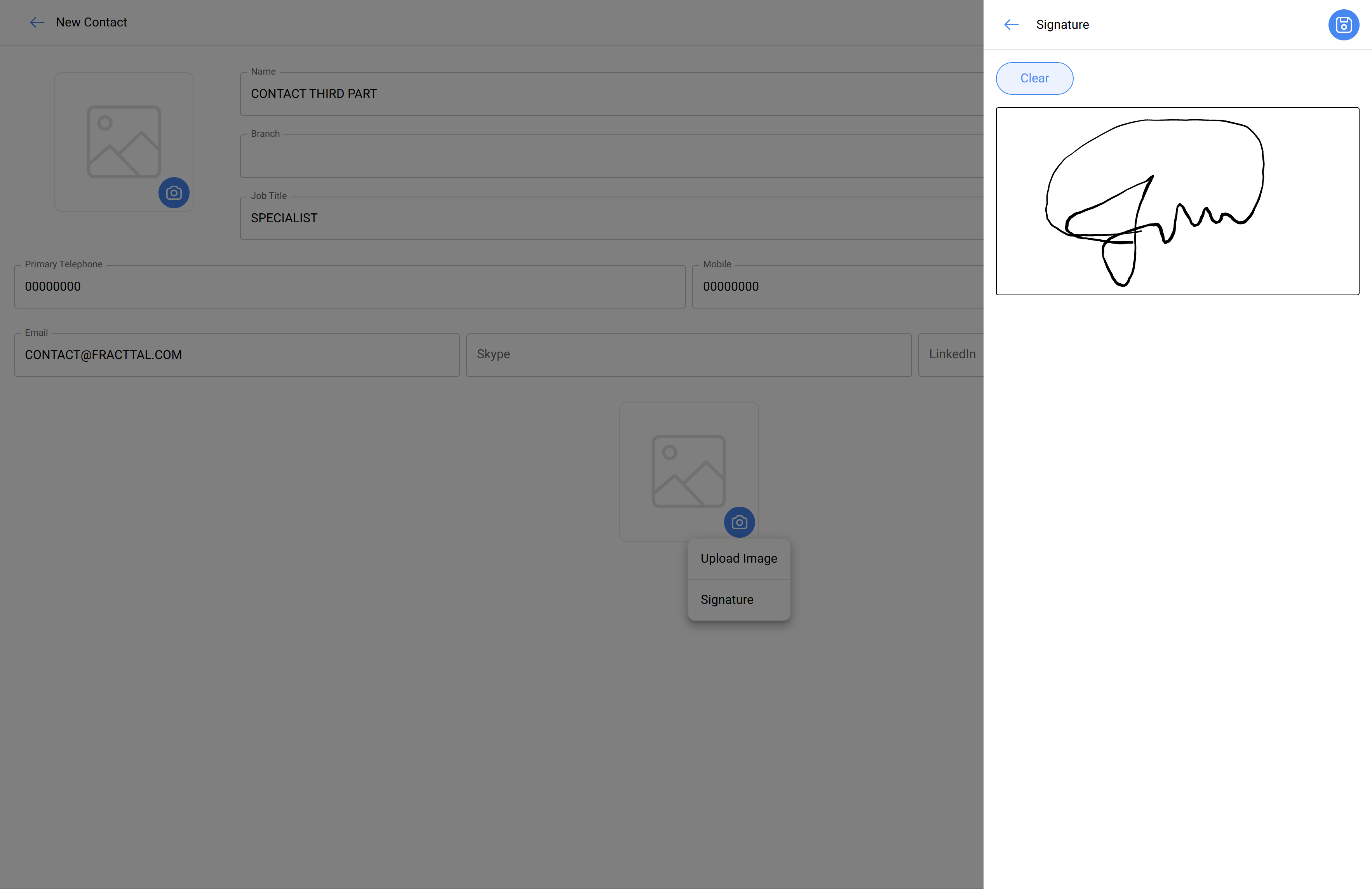 - Add contact signature: Click on the camera icon inside the gray circle at the bottom to insert a signature image or sign digitally.