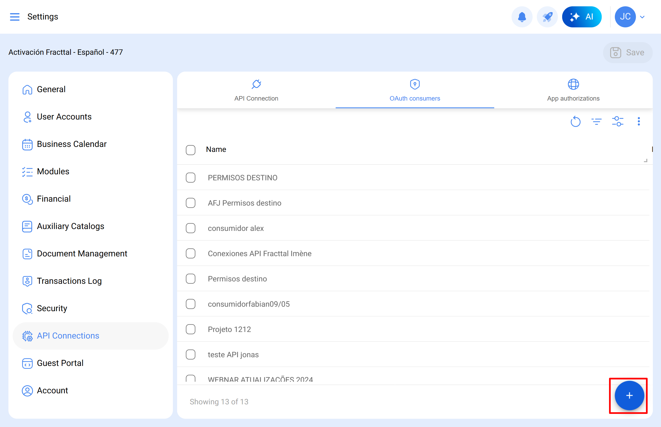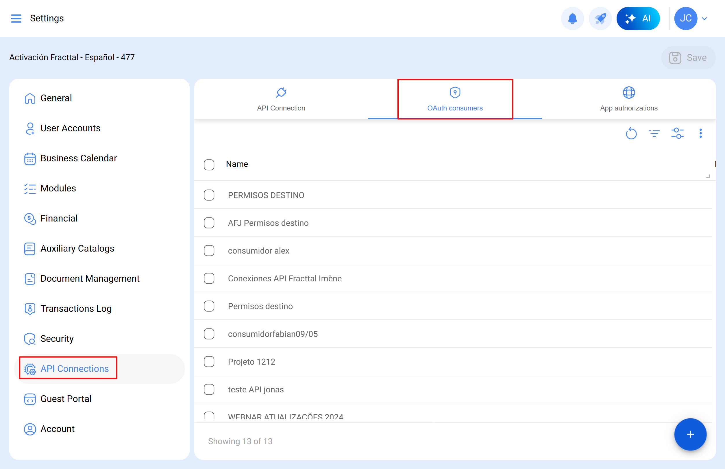 API Connection (OAuth Client): Create credentials (key and secret) for communication with the Fracttal One API, linking them to the permission group.