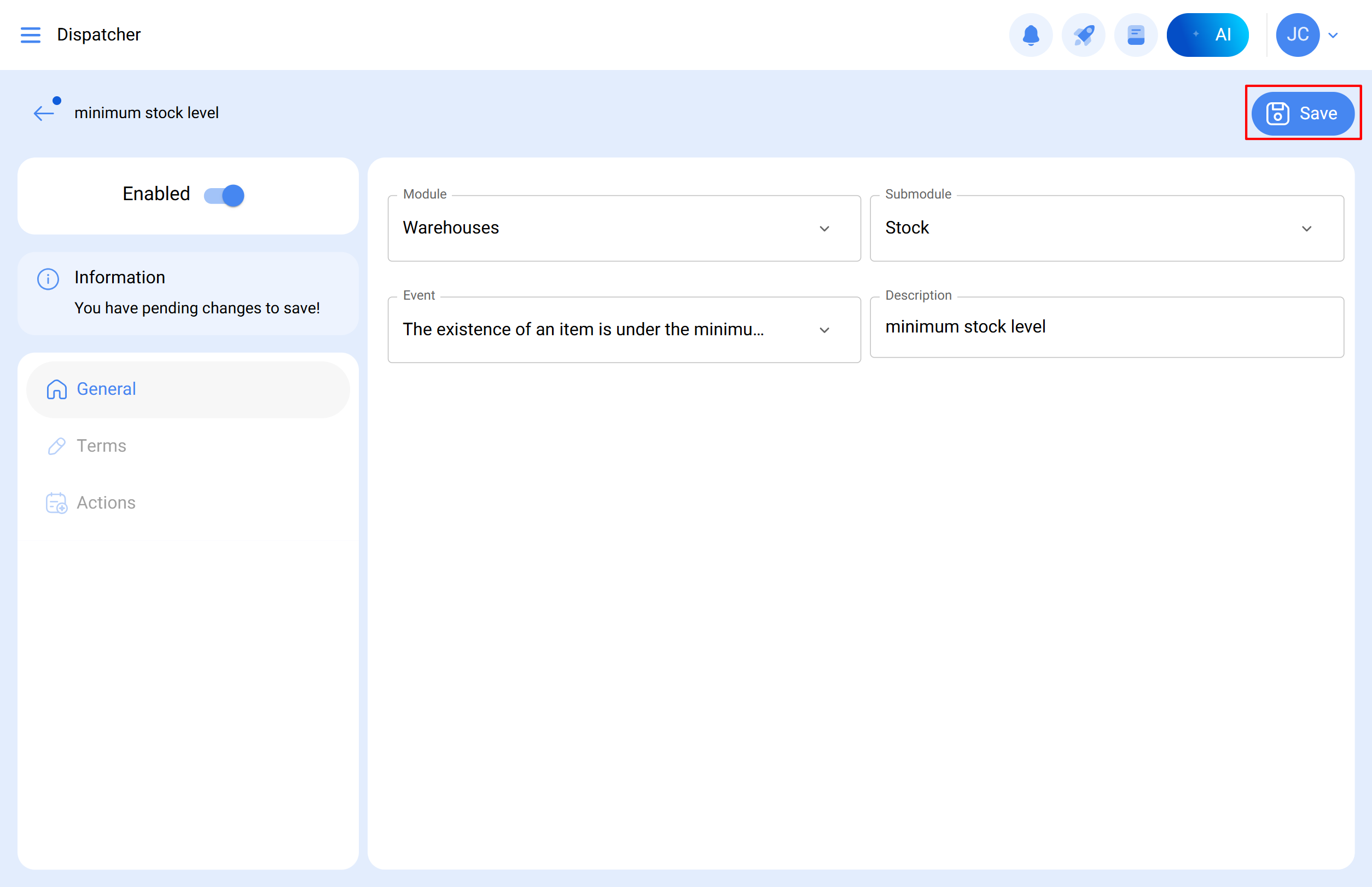 Once you have established the minimum stock level, you can set up an automatic notification through a rule in the platform's dispatcher. This rule will send an email alert when the item reaches the minimum level you defined.