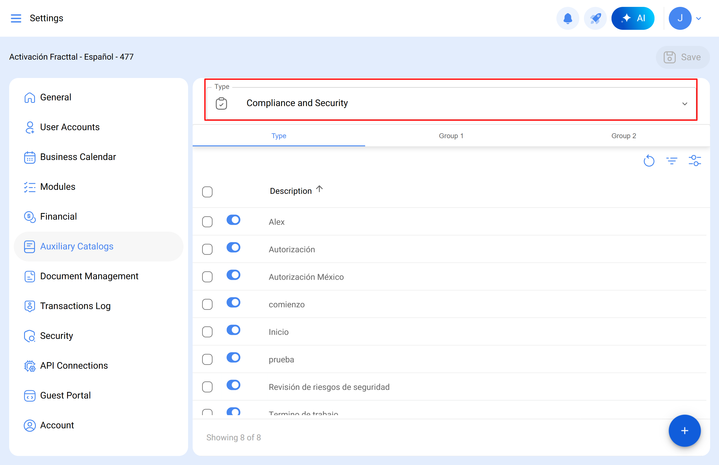 For defining the fields Classification 1, Classification 2, and Type, it is necessary to previously configure auxiliary catalogs: