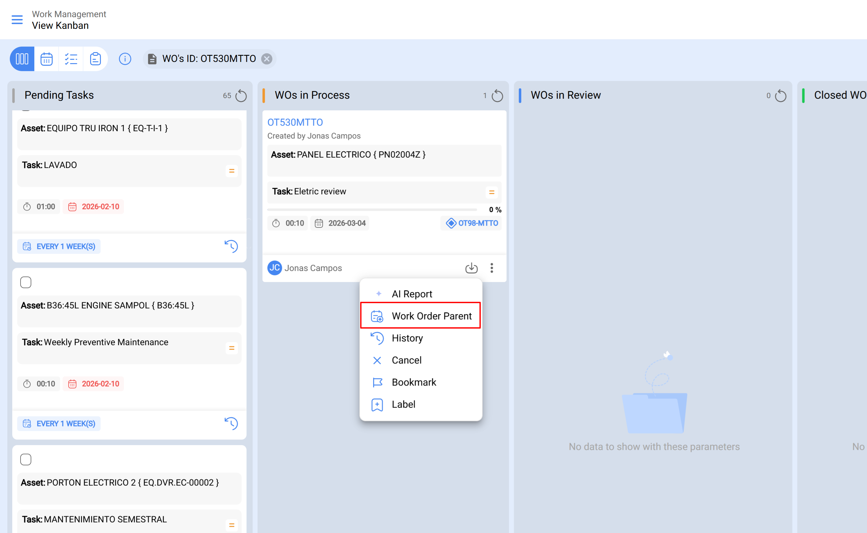 By clicking on the Parent WO option directly from the WO card in Kanban, the system will automatically redirect you to the Parent WO.
