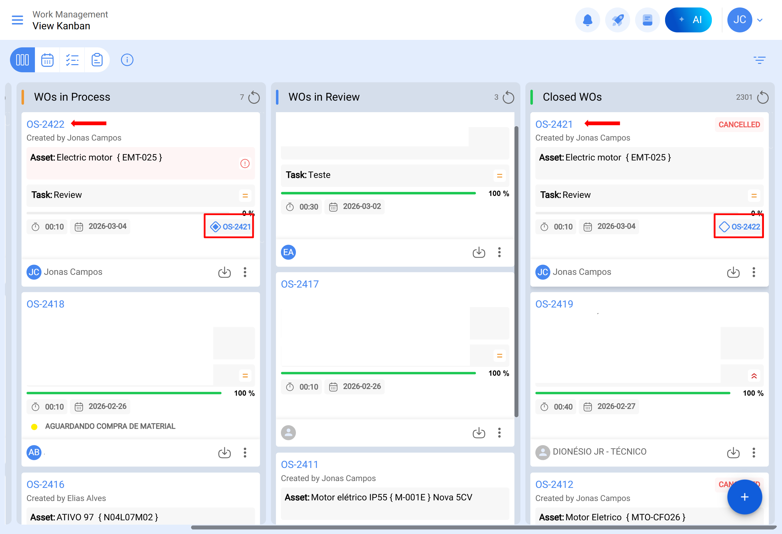 When a WO in "In Progress" status needs to be canceled and rescheduled, it allows maintaining traceability between both.