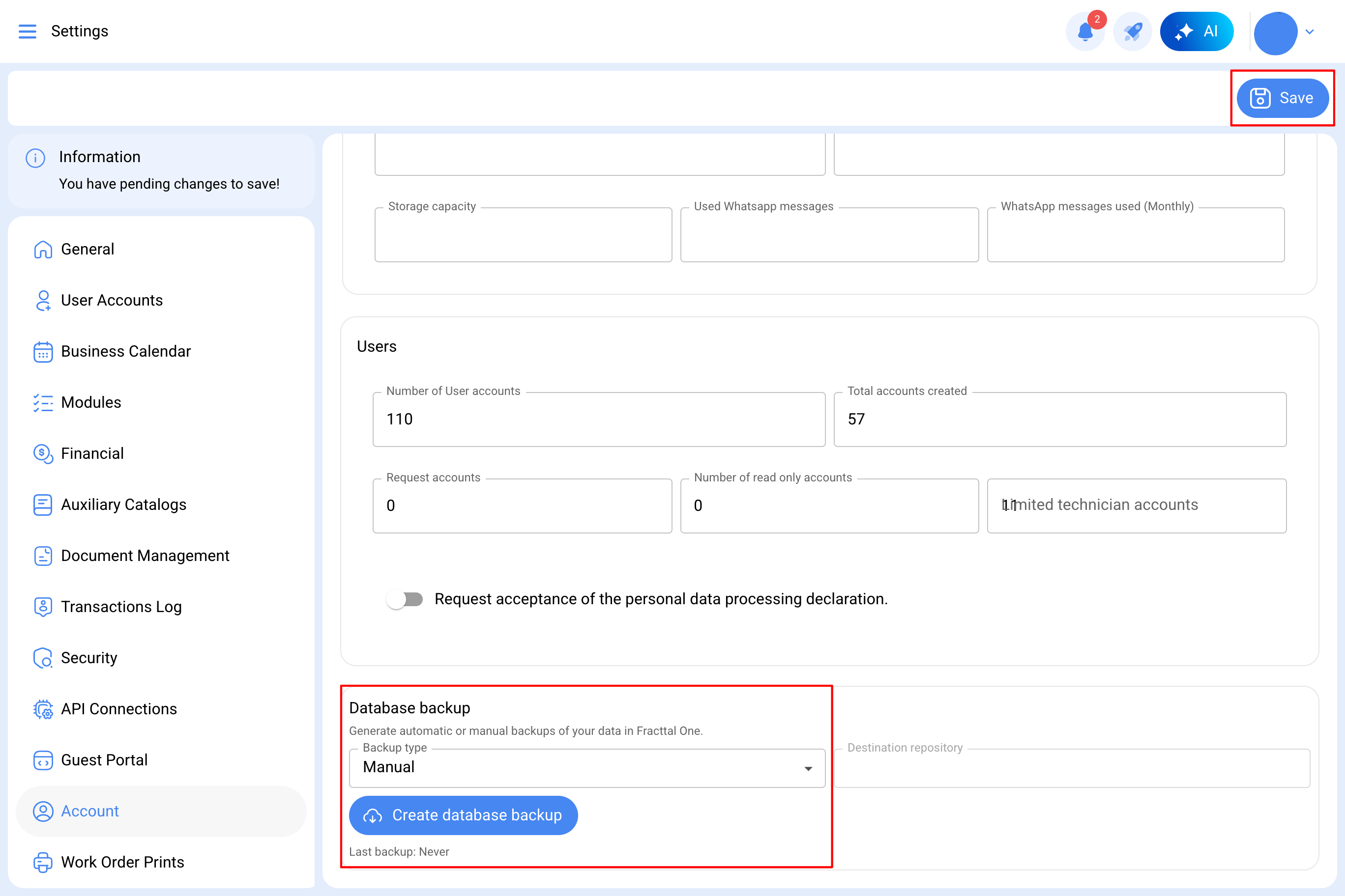 The database backup add-on for Fracttal One allows you to schedule automatic backups, making their creation easier without manual intervention. Backups run in the background and can be stored externally, ensuring secure and centralized storage.