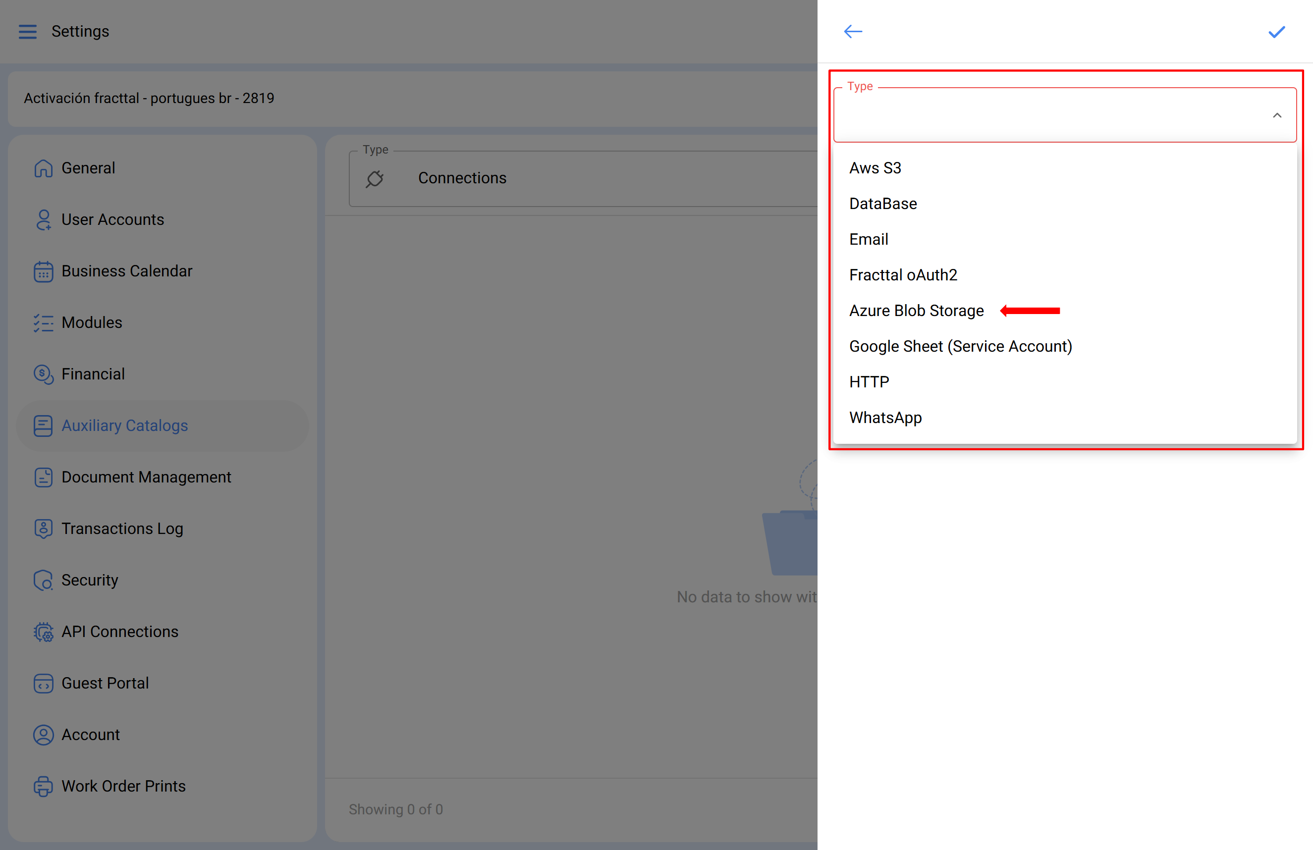 Storage account name: In this field, enter the name of the Azure storage account (Storage Account Name). This account is the main identifier in Azure and will be used to connect the Fracttal One platform with the Azure data storage service.