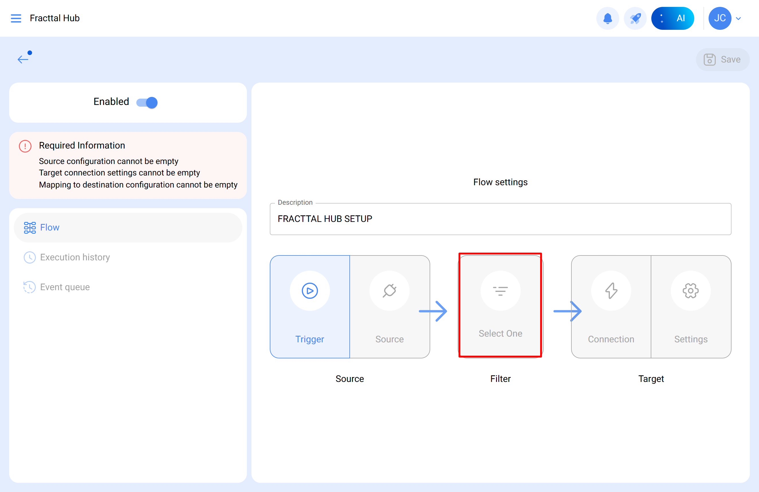 Finalmente, habilite el ETL creado, guarde los cambios y ejecute.