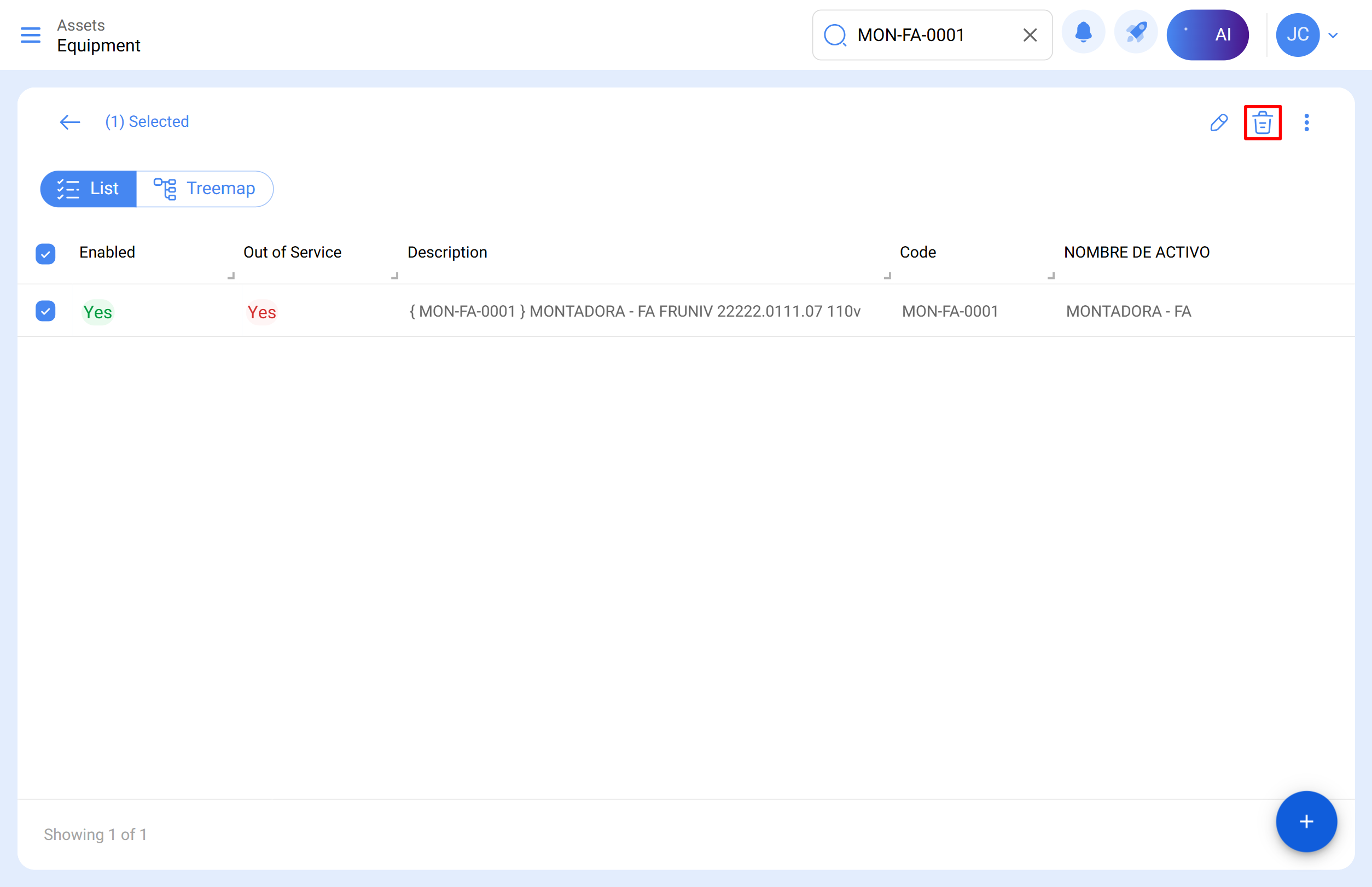 Una vez dentro del módulo, se mostrará automáticamente la lista completa de activos. Puedes utilizar los filtros o la barra de búsqueda para localizar el activo que deseas eliminar.