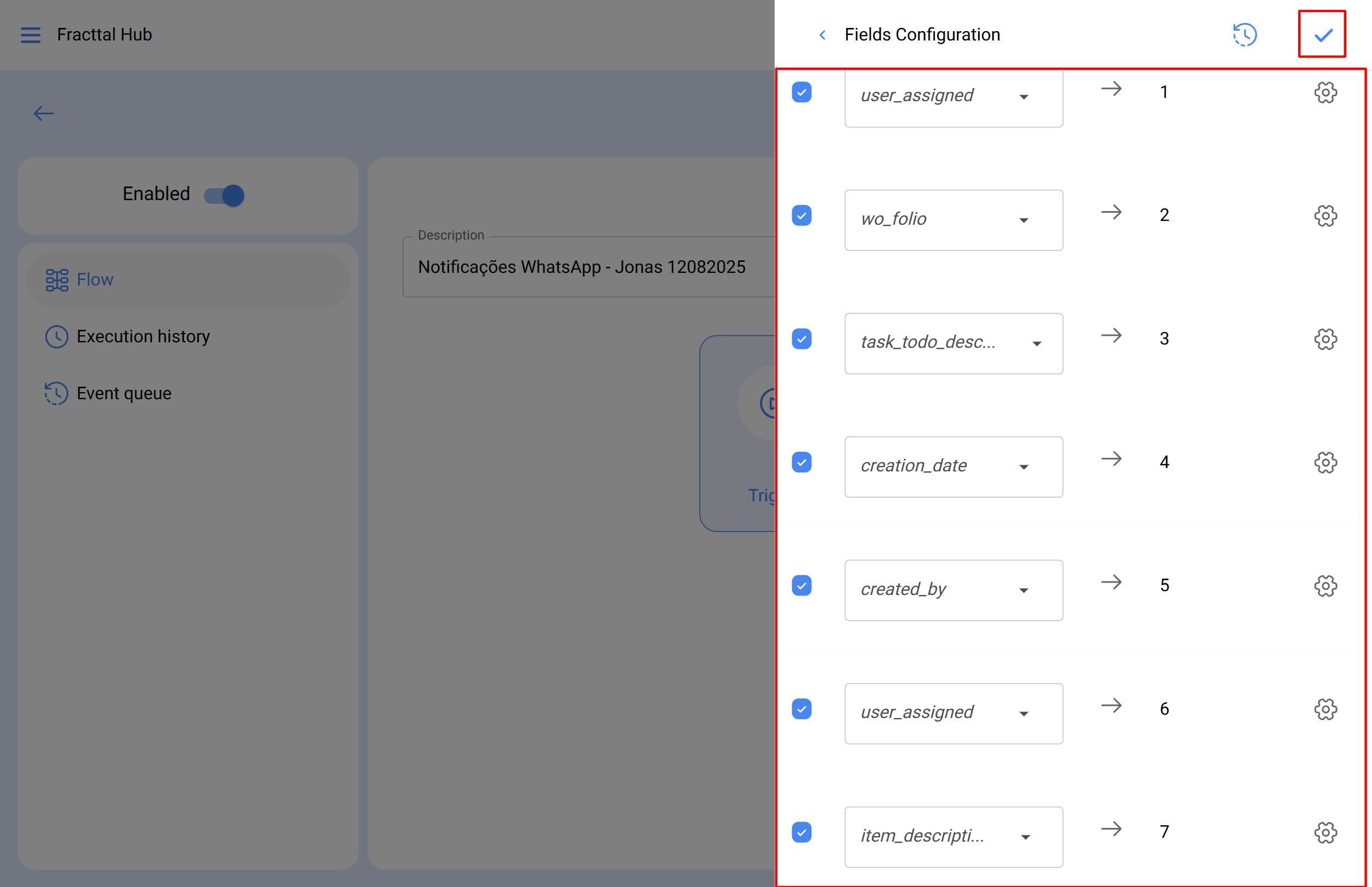 Fracttal Hub: Seleccione el flujo que creó en el Paso 3 (Envío de notificación de en WhatsApp).