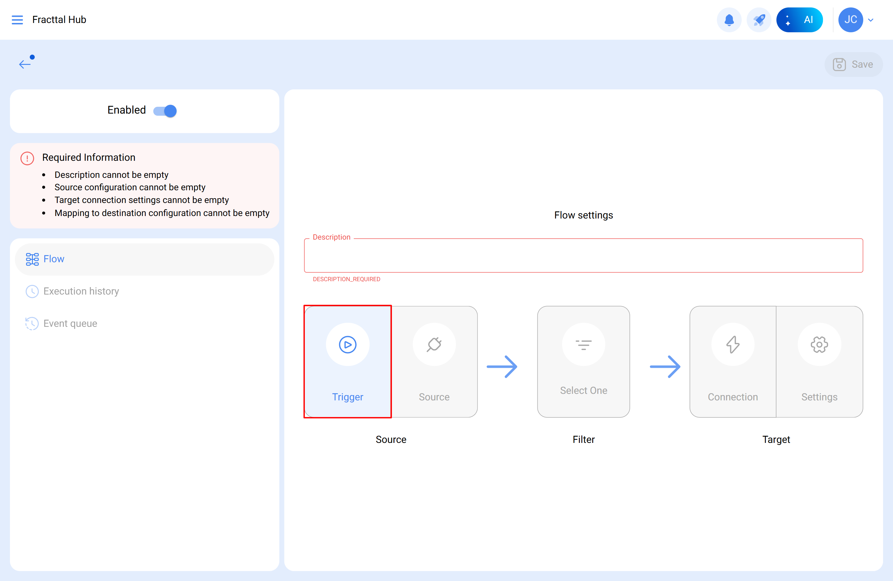 La pantalla del flujo se divide en partes: Activador, Fuente, Conexión y Configuración.