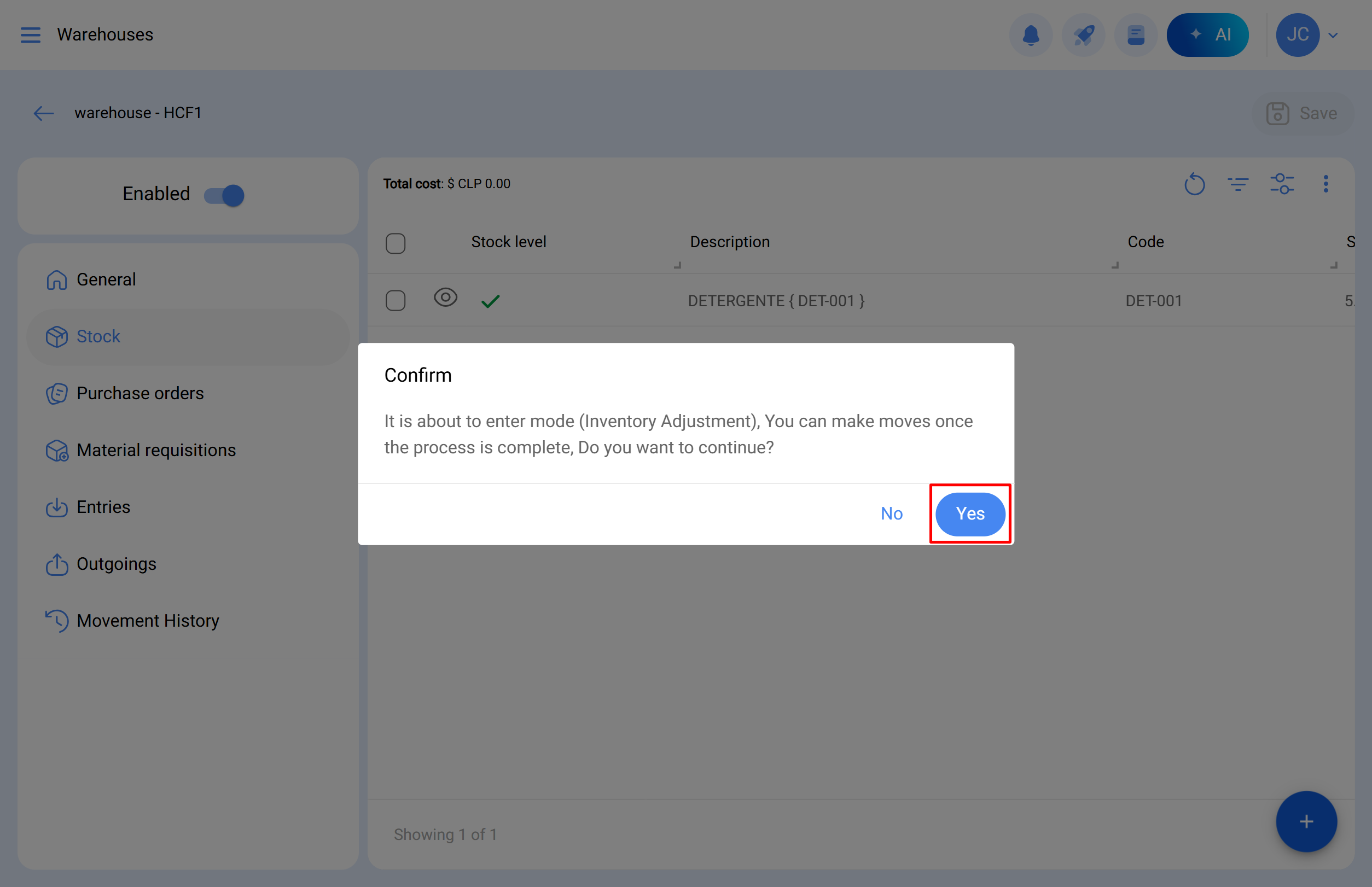 Realice el ajuste de inventario: Con el ítem seleccionado, haga clic en "Ajuste de inventario" en el menú lateral. Esta opción le permitirá modificar la existencia del ítem y realizar los ajustes necesarios.