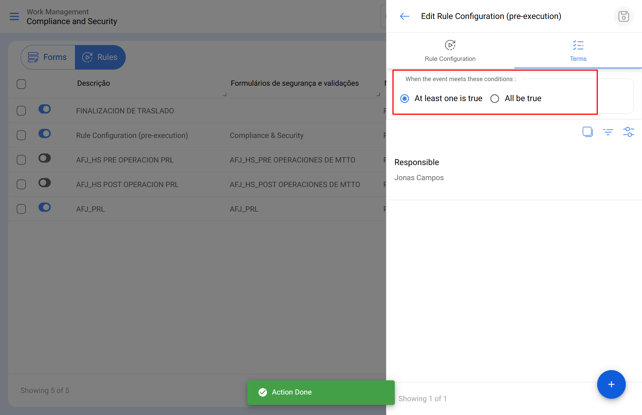 Entre las opciones disponibles, puede seleccionar que al menos una condición sea verdadera o que todas las condiciones deben ser verdaderas para validar la regla.