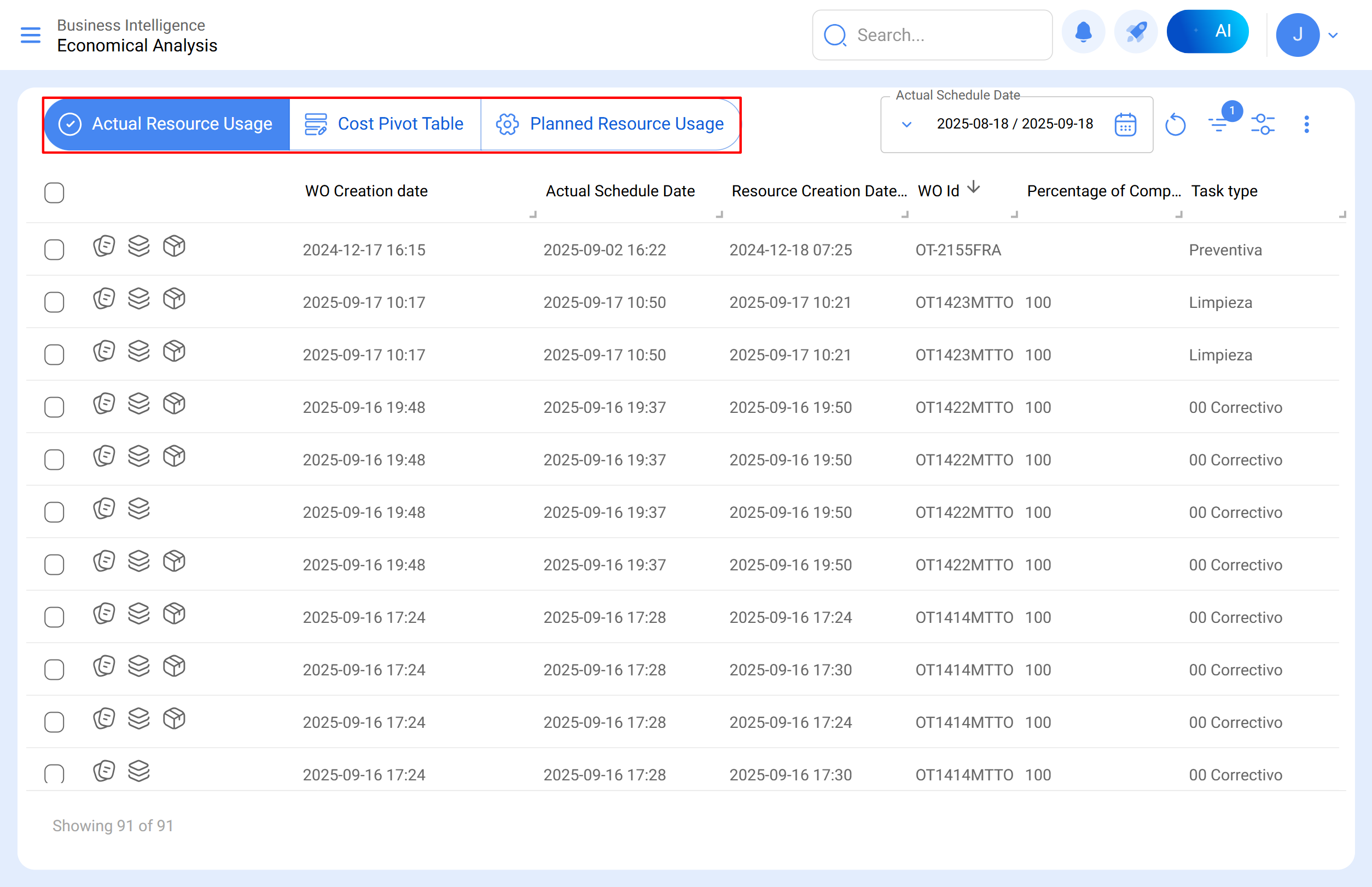 El Análisis de Tareas presenta gráficos para evaluar cómo se cumplen las tareas programadas y realizadas, comparar las tareas planificadas con las no planificadas, clasificar los tipos y revisar las reprogramaciones y pausas dentro de las órdenes de trabajo. Además, el análisis de órdenes de Trabajo ofrece visualizaciones que, a través de un análisis detallado, ayudan a comprender la evolución en la creación y cierre de órdenes, los motivos de cancelación y la calidad del servicio, facilitando así la toma de decisiones informadas a medio y largo plazo.
