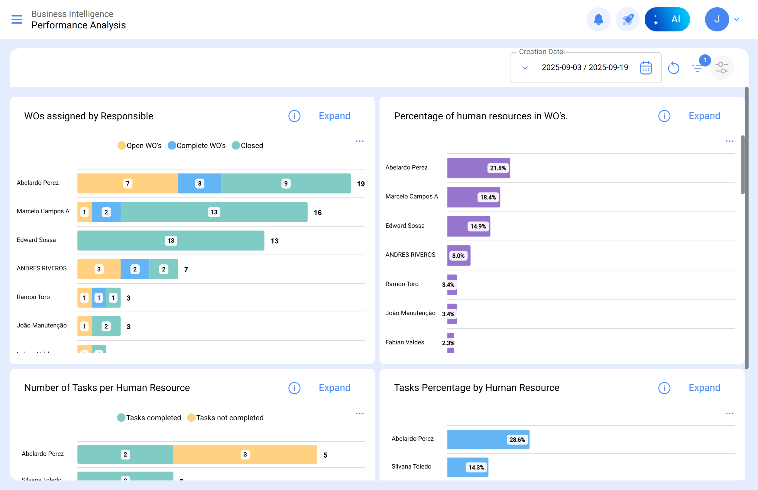 El módulo de Análisis de Performance se enfoca en la gestión y distribución de Órdenes de Trabajo y tareas entre los miembros del equipo de mantenimiento. Ayuda a identificar desbalances en la carga de trabajo y a evaluar el desempeño de cada técnico o responsable.