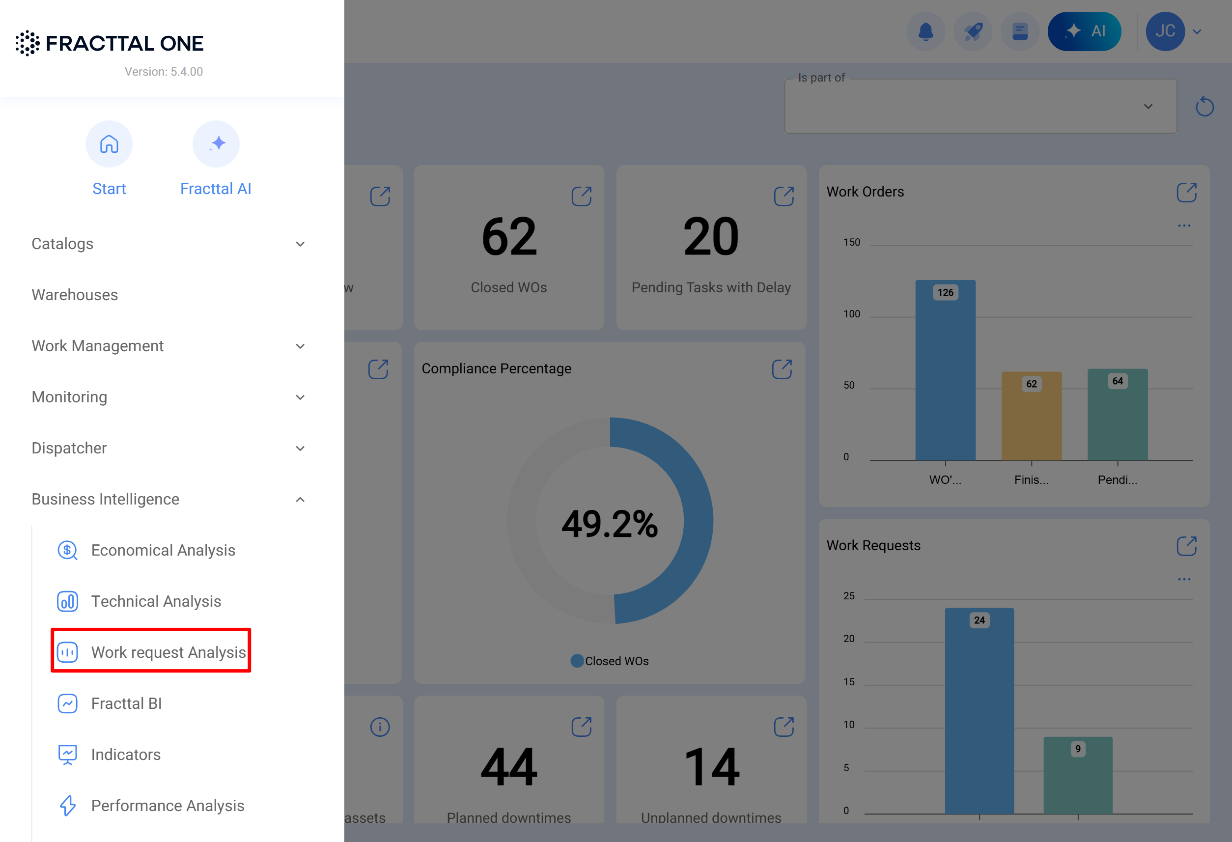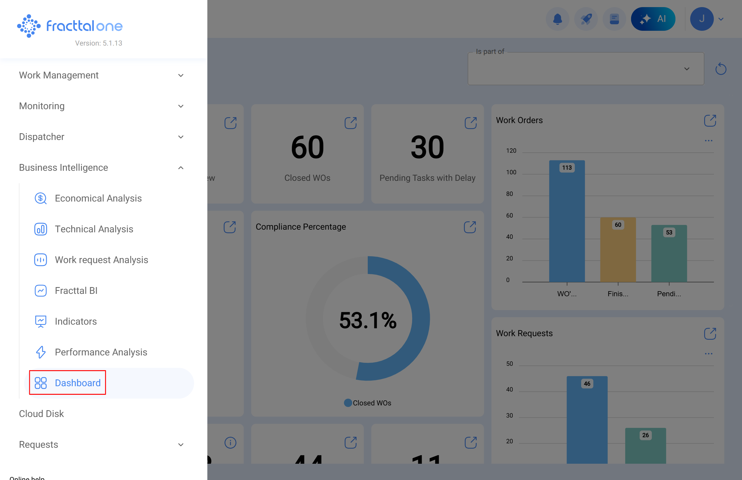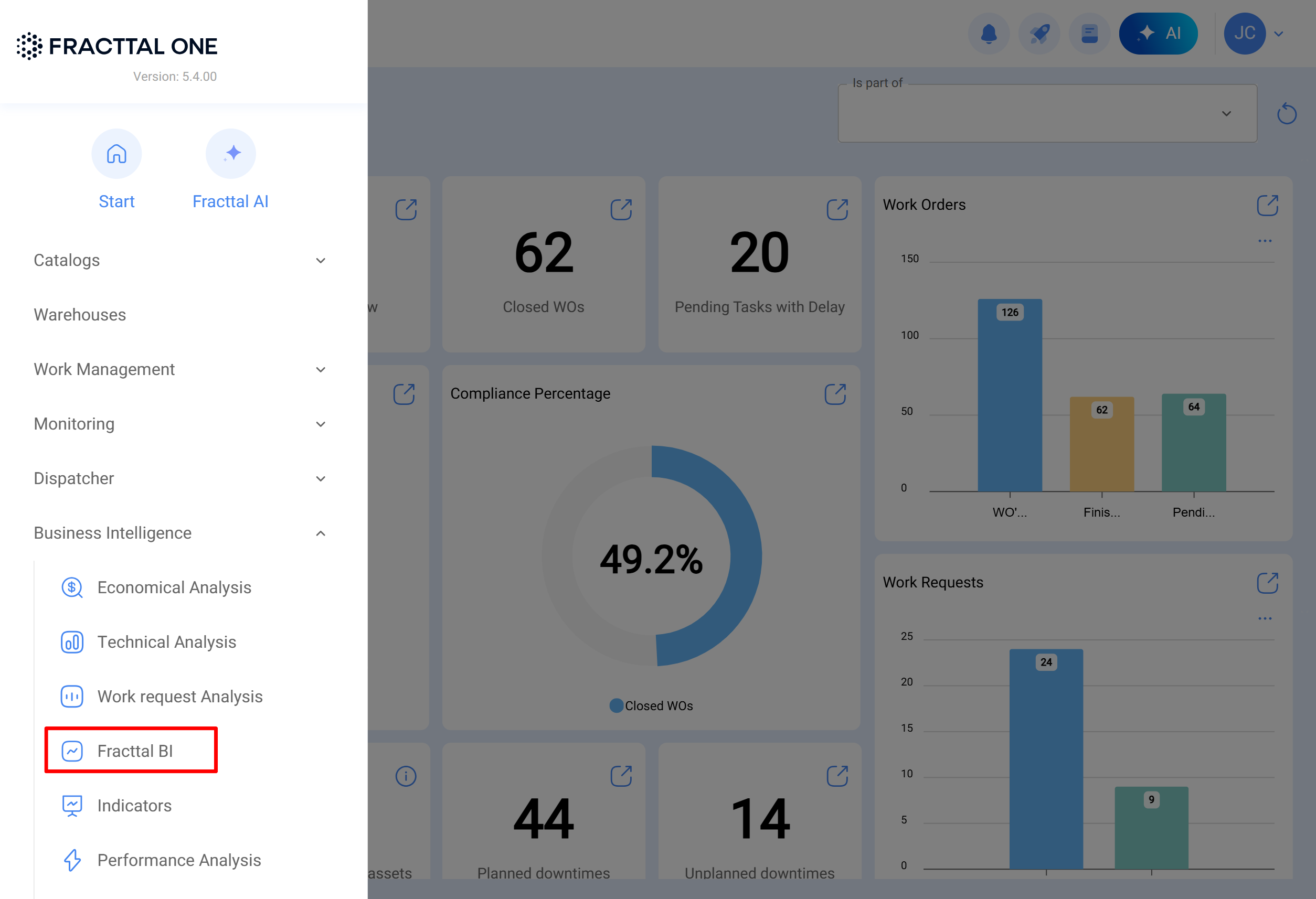 Este módulo permite analizar y visualizar datos clave de mantenimiento para optimizar recursos, mejorar la eficiencia y seguir KPIs. Con dashboards intuitivos, informes detallados y análisis avanzados, Fracttal BI facilita la gestión estratégica del mantenimiento.