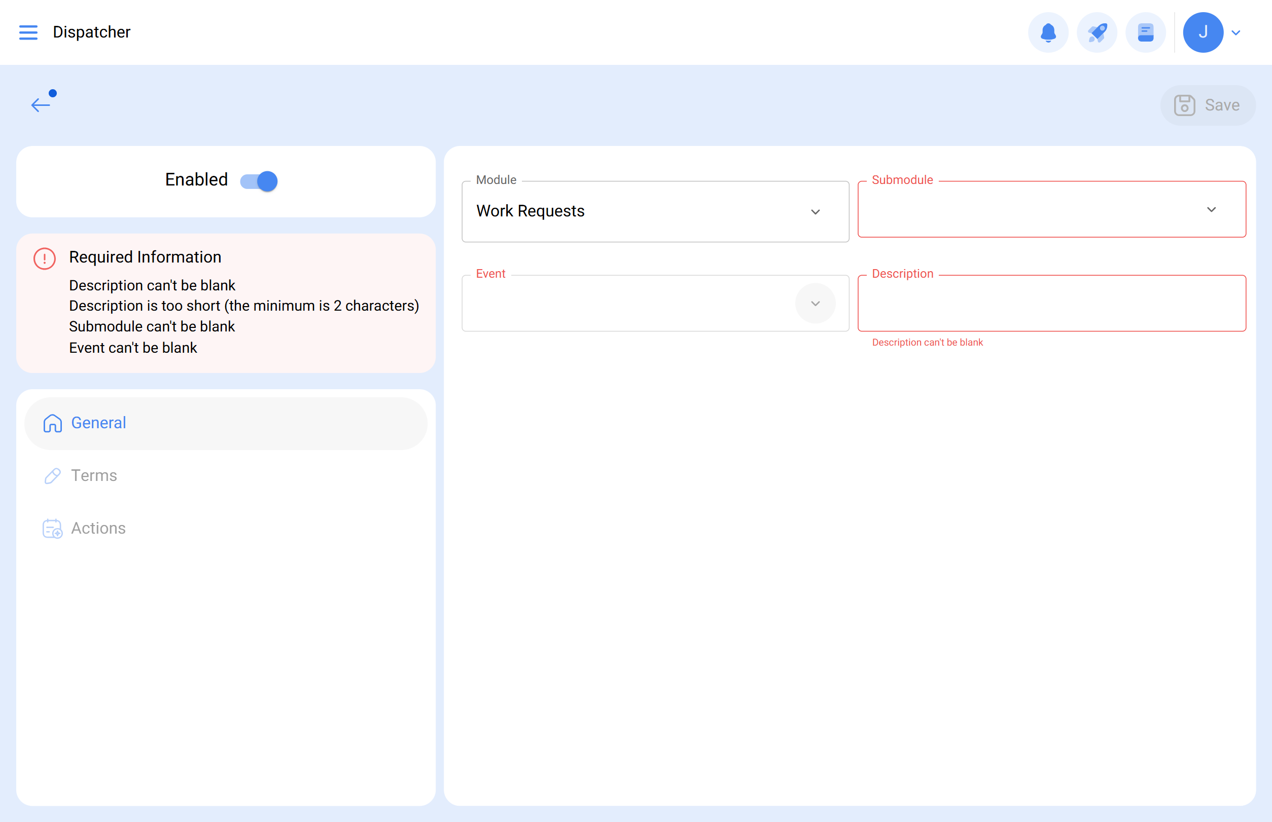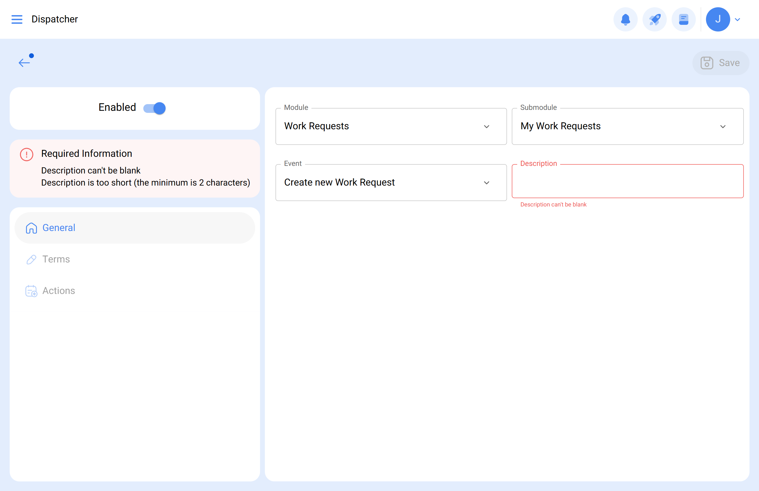 En Evento, seleccione el disparador para crear Nueva Solicitud. Agregue una descripción según corresponda.