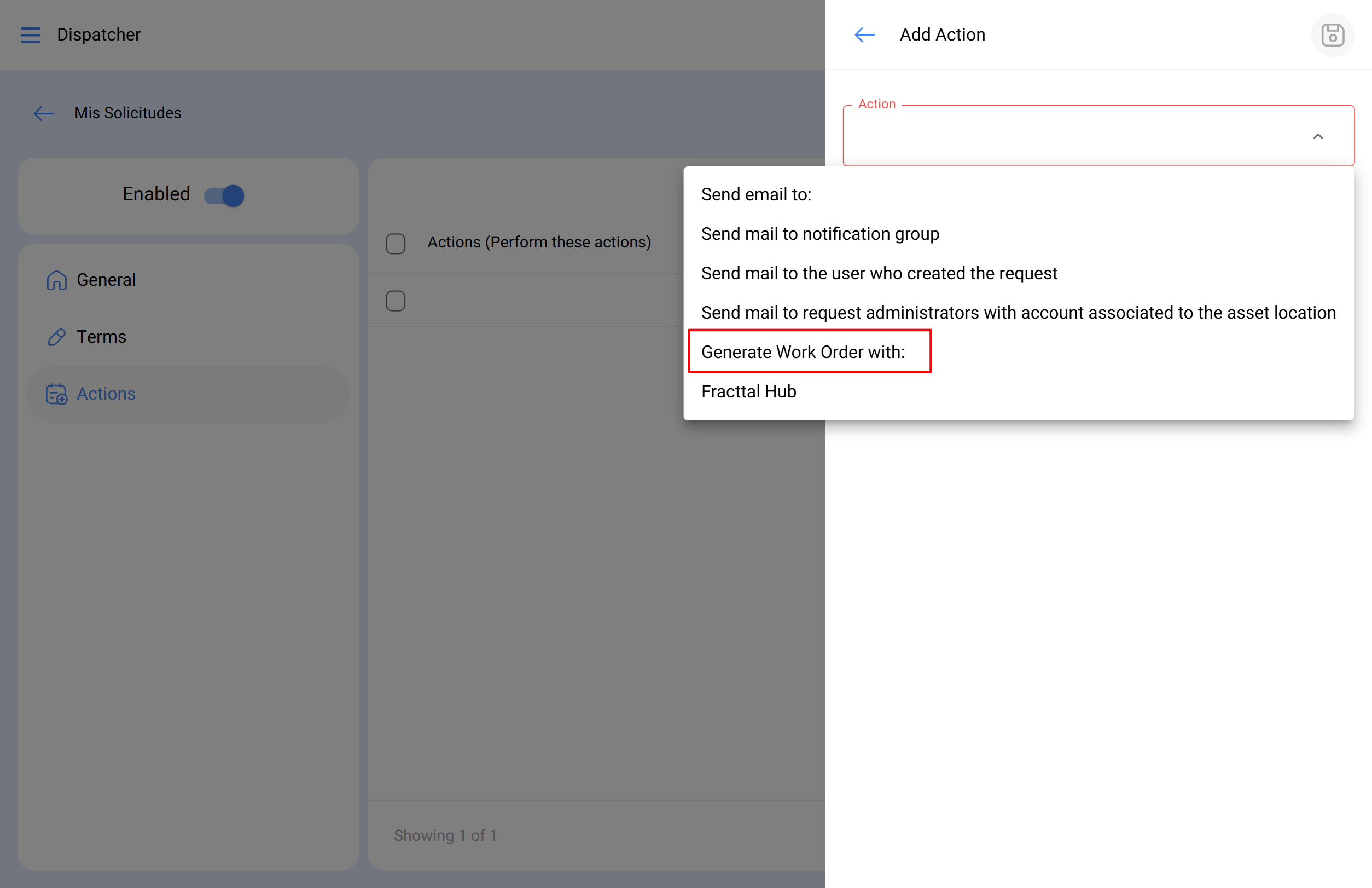 Agregue la acción Generar Orden de Trabajo con: