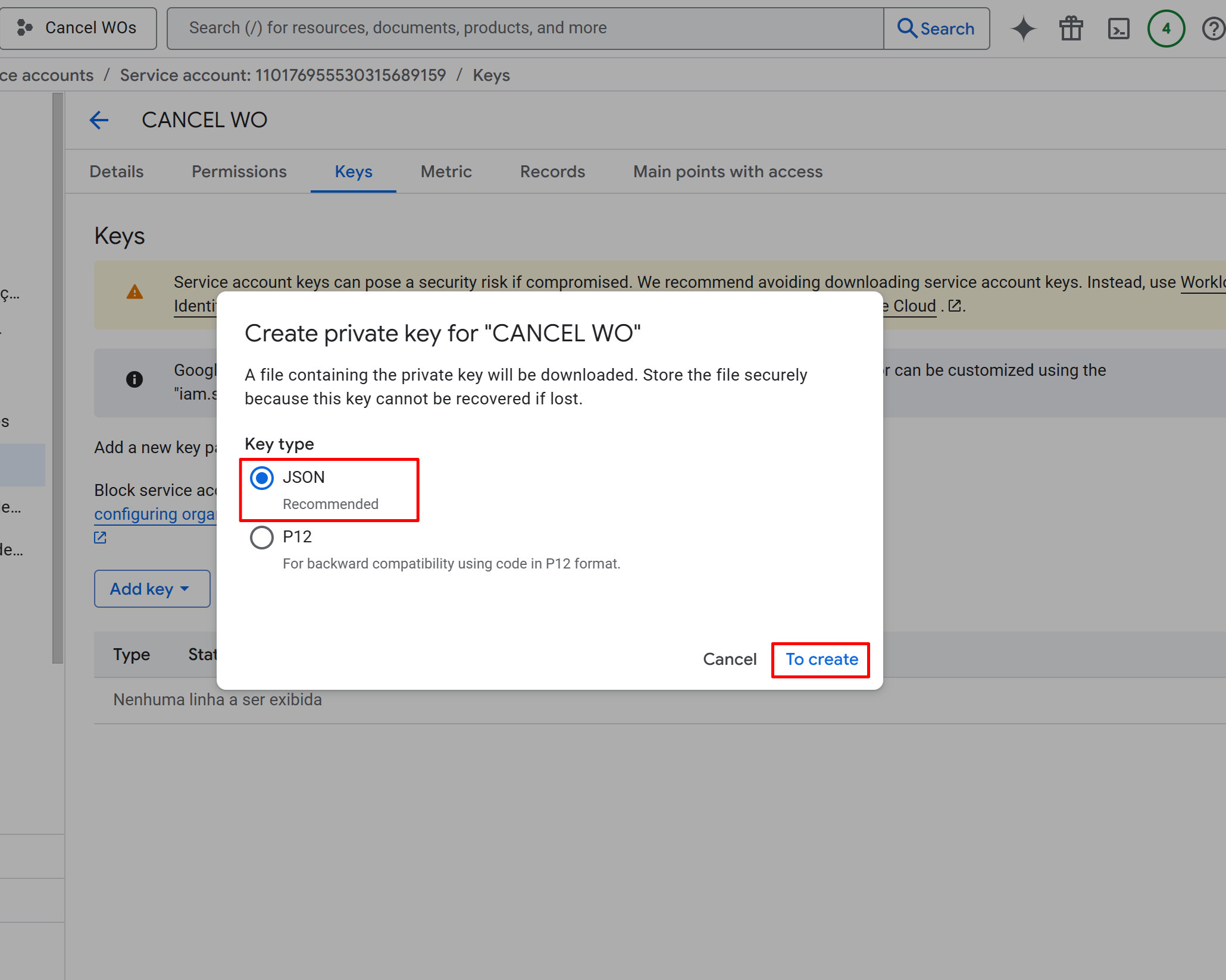 Asegúrate de que el tipo de clave sea JSON (opción recomendada) y haz clic en "Crear".