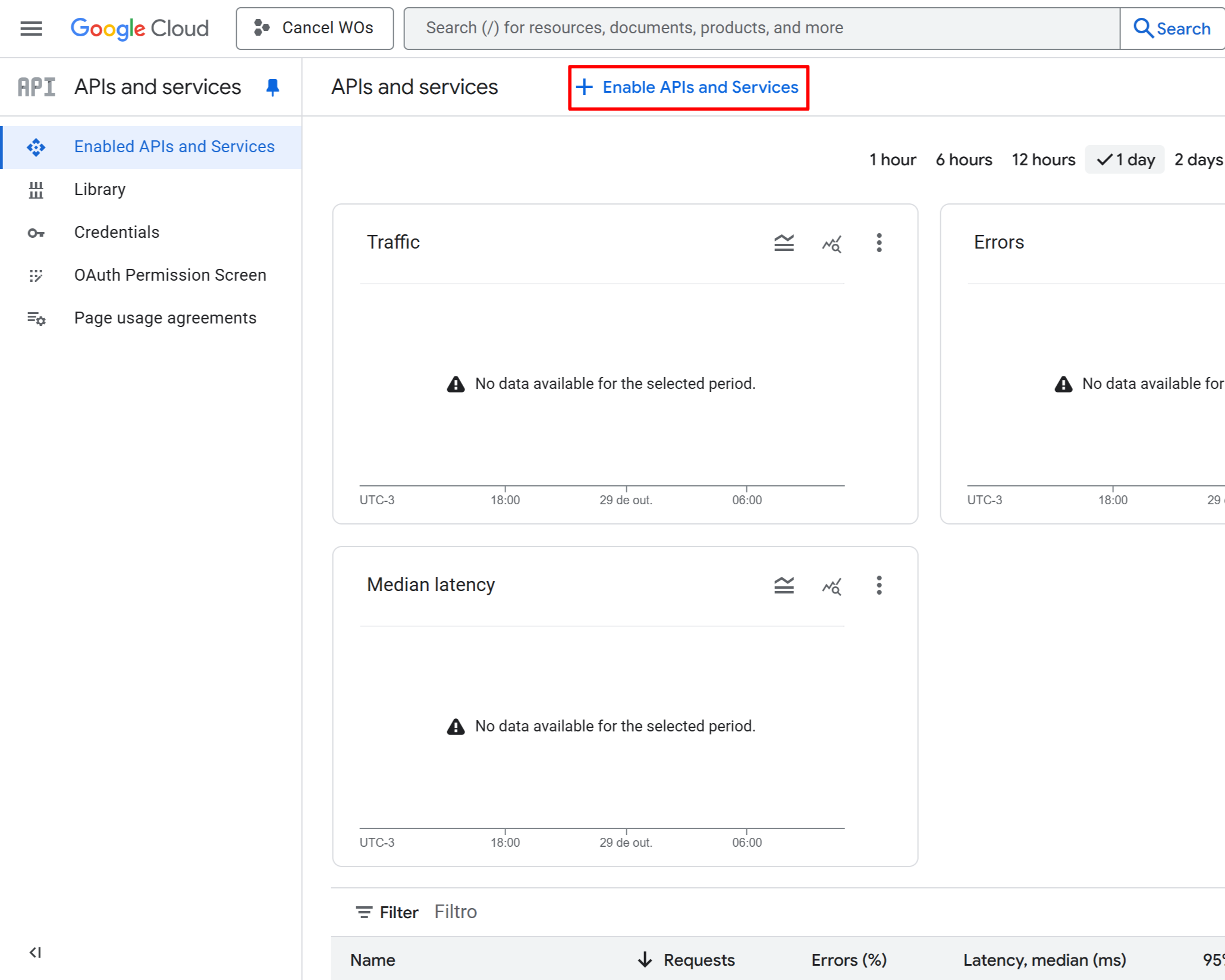 Haz clic en el botón "+ HABILITAR APIS Y SERVICIOS".