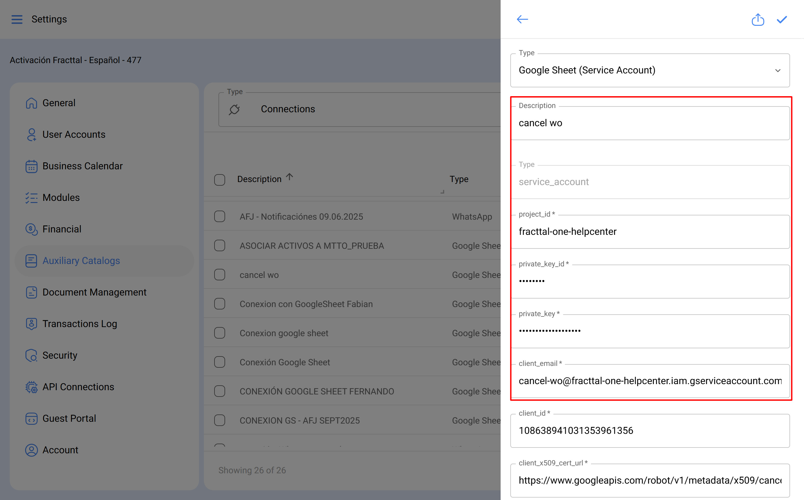 Ahora, configuraremos la conexión dentro de Fracttal para que pueda utilizar las credenciales de Google.