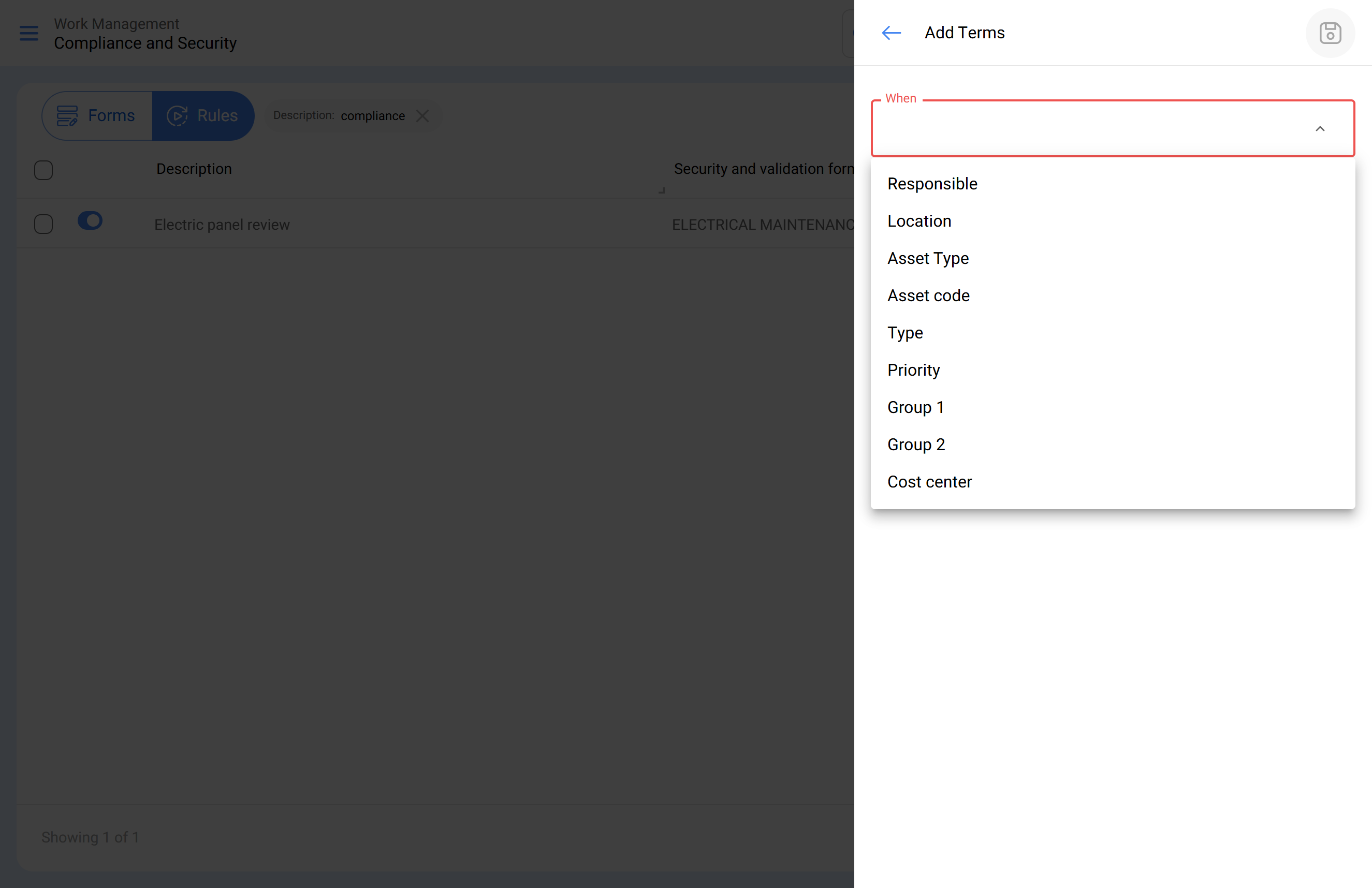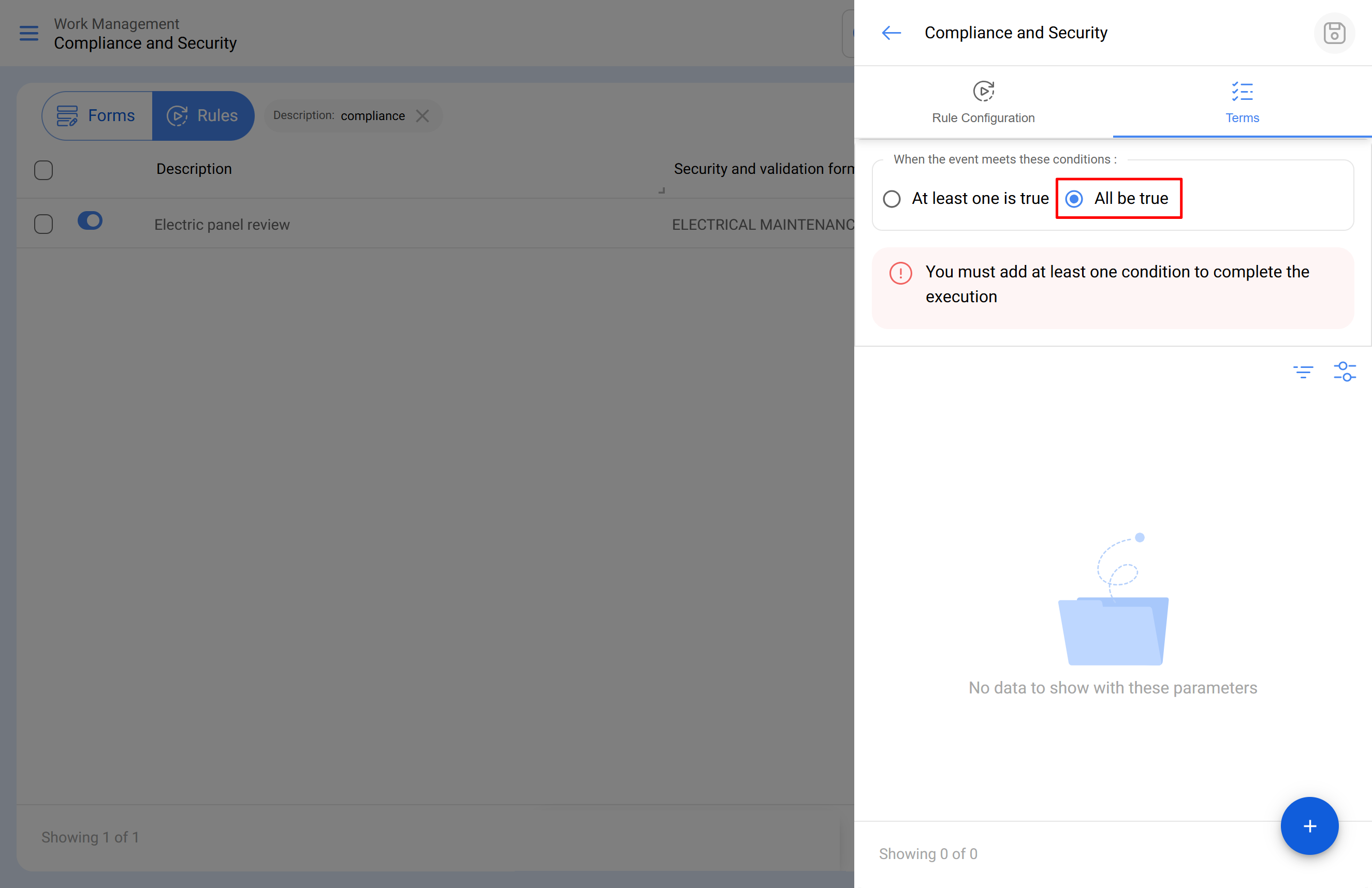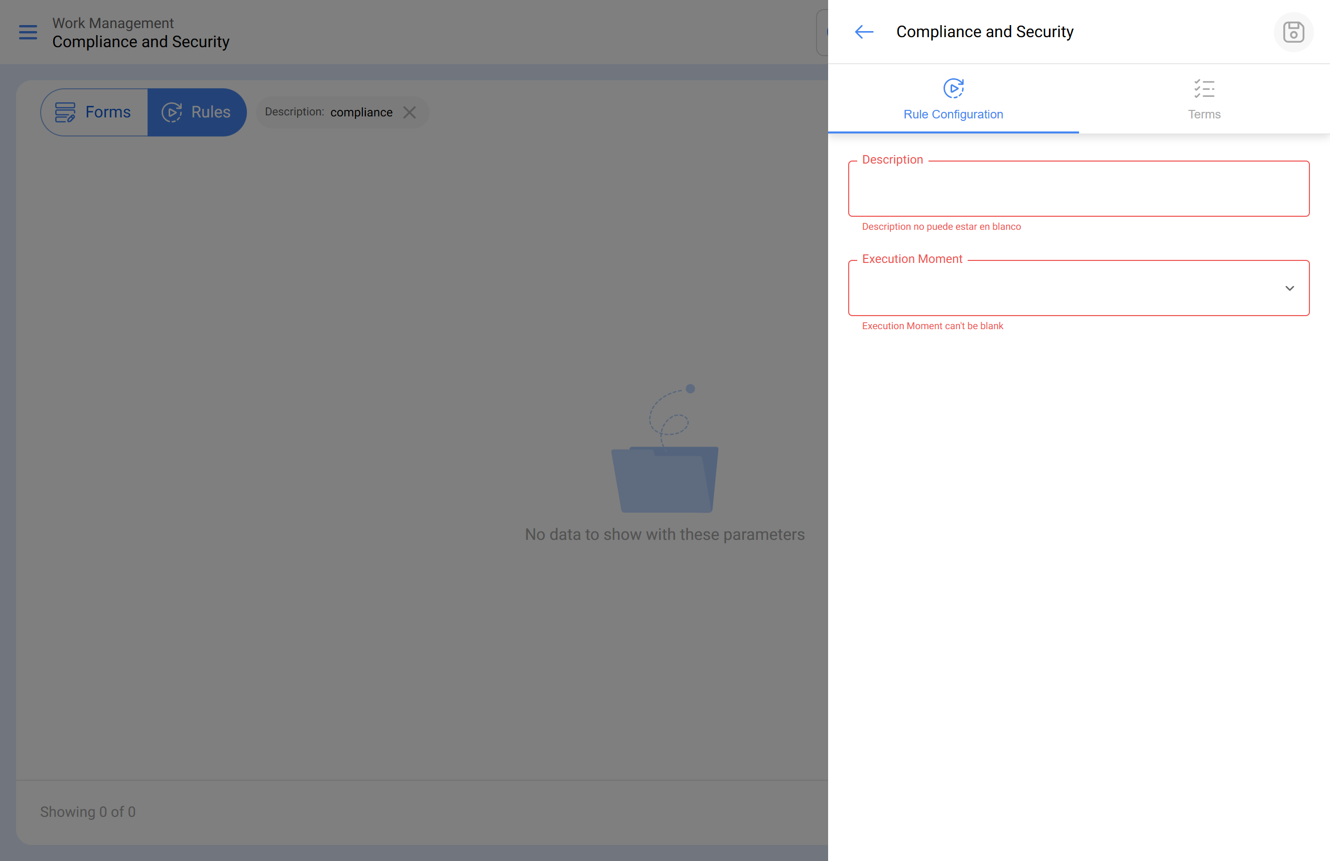 Dentro del submódulo Compliance y Seguridad, la sección “Reglas” permite definir condiciones específicas para determinar cuándo un formulario debe mostrarse durante la ejecución de una tarea. Con ello, el sistema solicita validaciones únicamente cuando son necesarias, asegurando el cumplimiento de los procedimientos internos de seguridad y calidad.