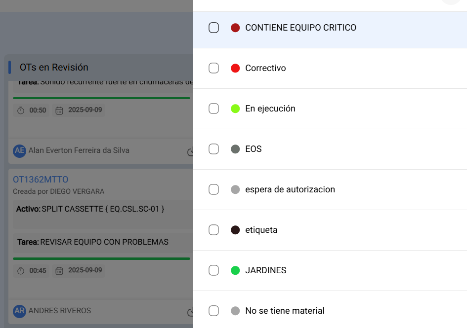 Qué etiquetas usan para clasificar las OTs (por tipo de tarea, prioridad, área, etc.)?