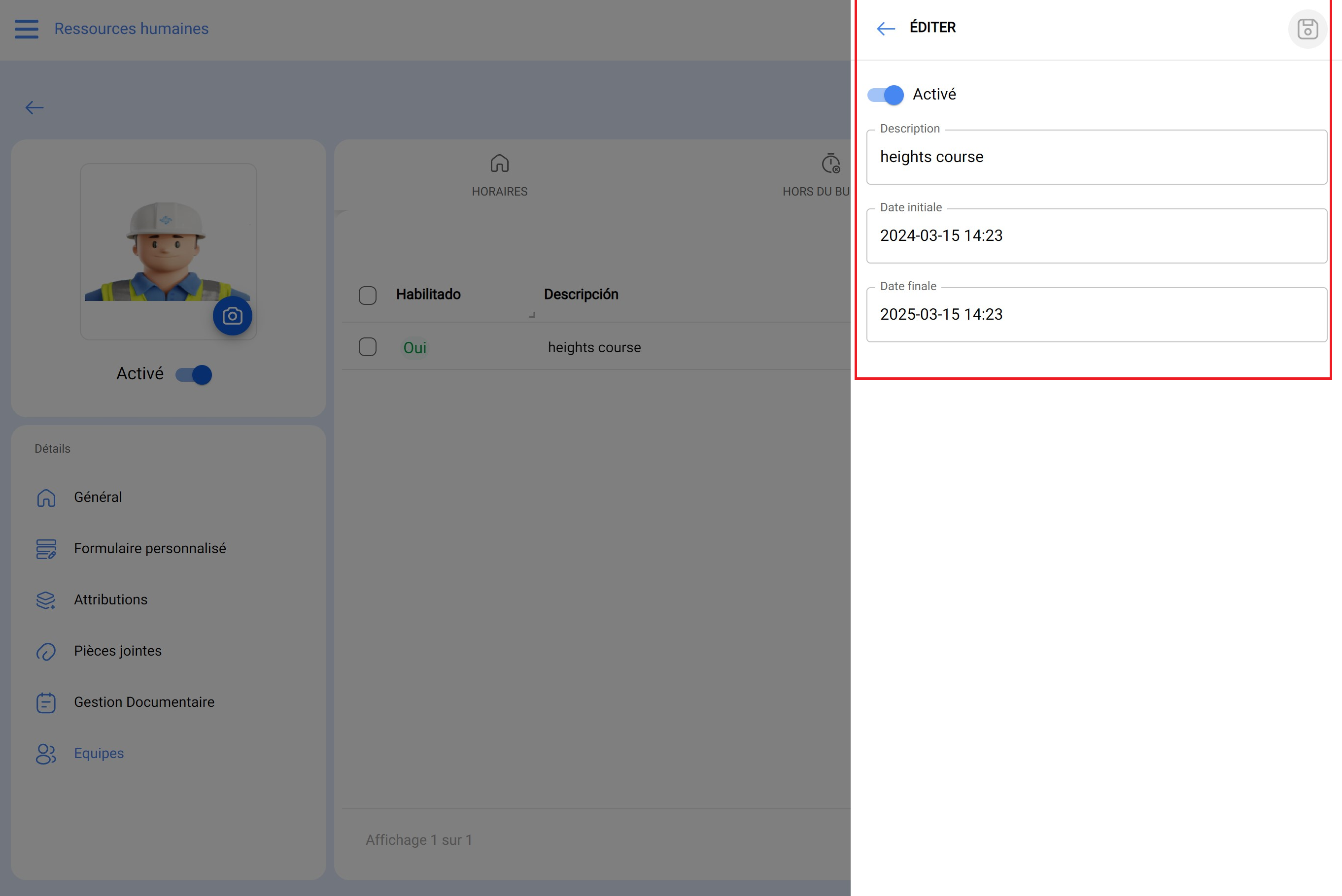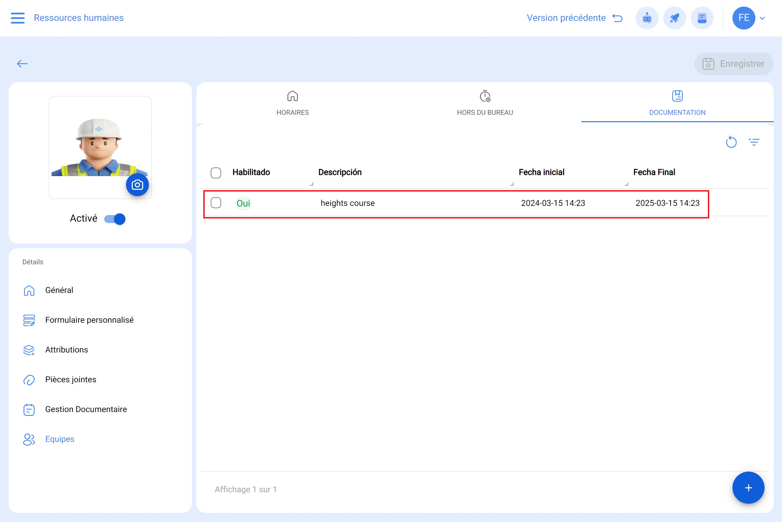 Contrairement à la gestion des documents des autres modules, la documentation des équipes génère des restrictions lors de l'exécution des activités, de sorte que si une ressource humaine dispose d'un document expiré, elle ne pourra pas exécuter la tâche tant que ce document n'aura pas été renouvelé. Par exemple, elle peut être utilisée pour les documentations qui sont restrictives pour l'exécution de certaines activités.