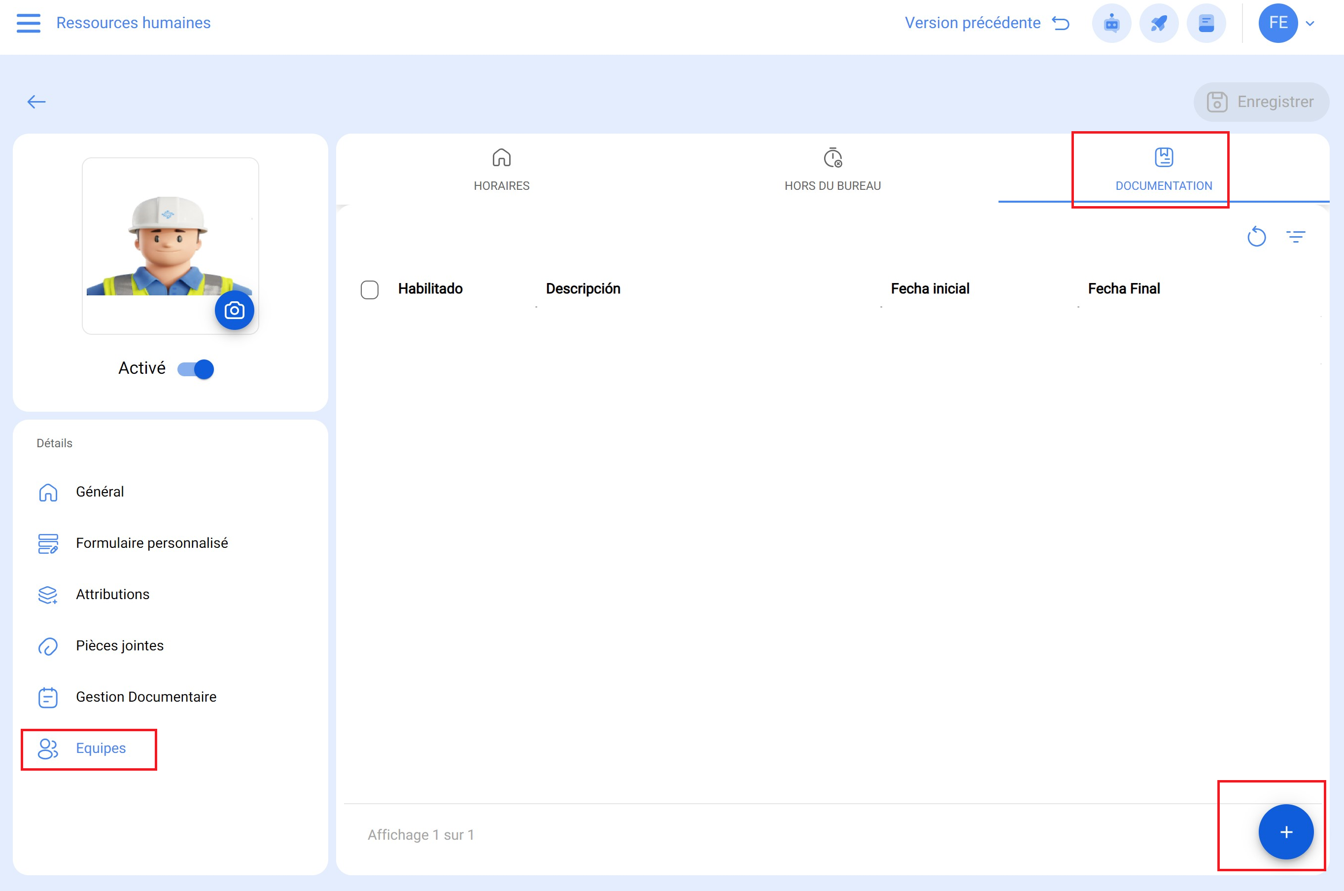Pour ajouter un document dans les équipes, vous devez entrer dans le sous-module "Documentation" qui se trouve dans le profil Ressources humaines de l'utilisateur en question (ce profil d'utilisateur doit être préalablement associé à un horaire d'équipe).
