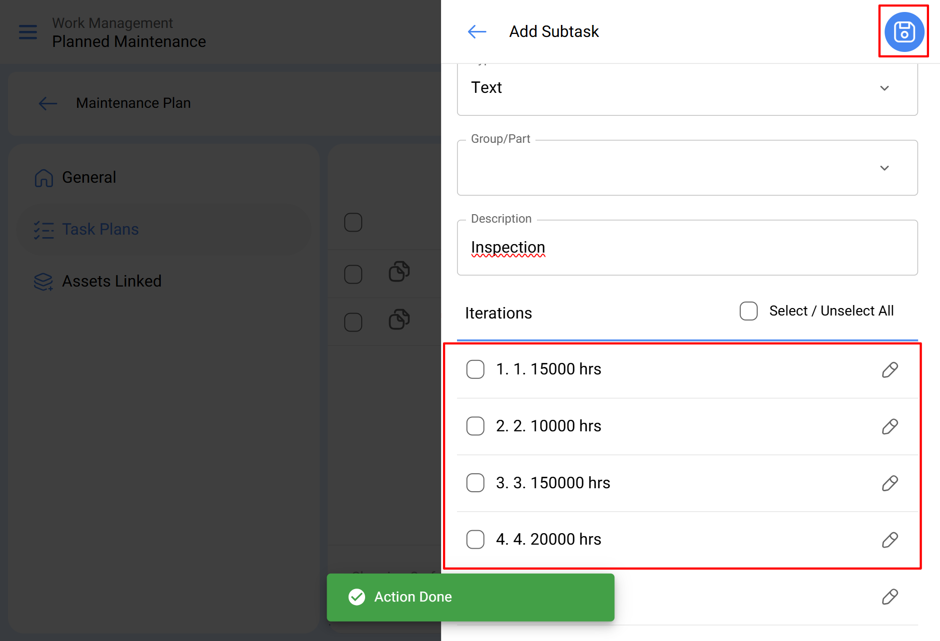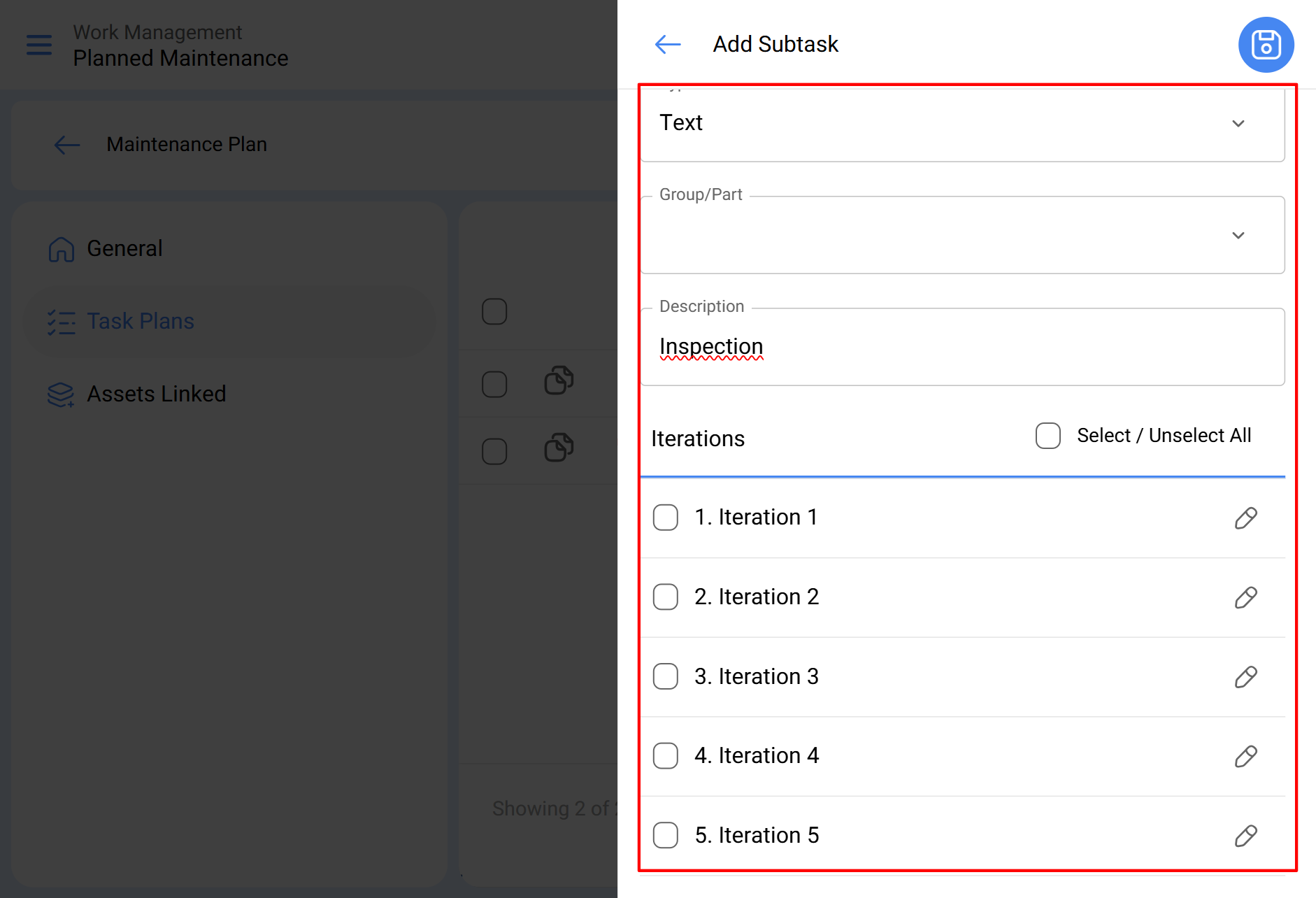 Avec la fonction d'itérations, il est possible de déterminer à quelle partie du cycle d'une tâche chaque sous-tâche doit être exécutée, afin d'avoir un meilleur contrôle du cycle complet d'entretien.