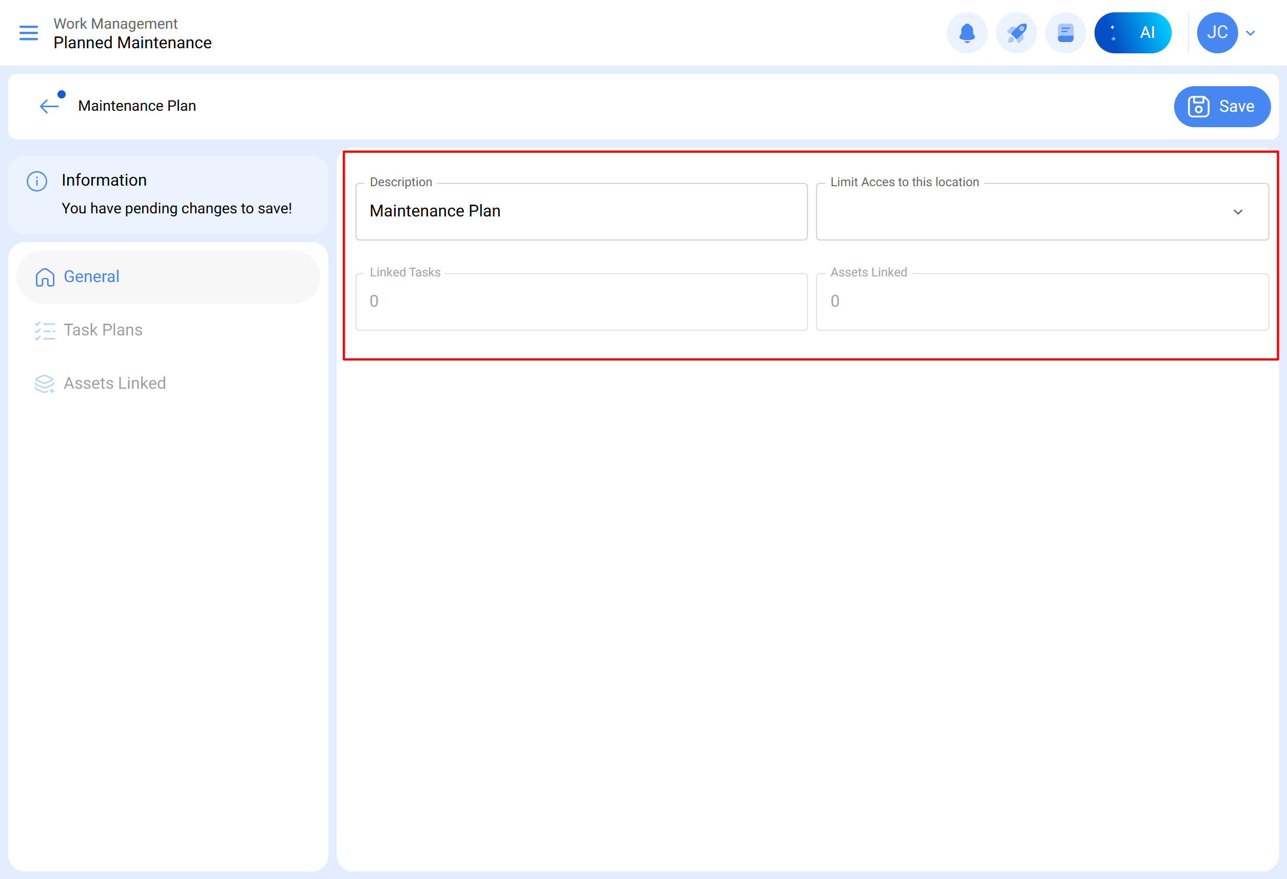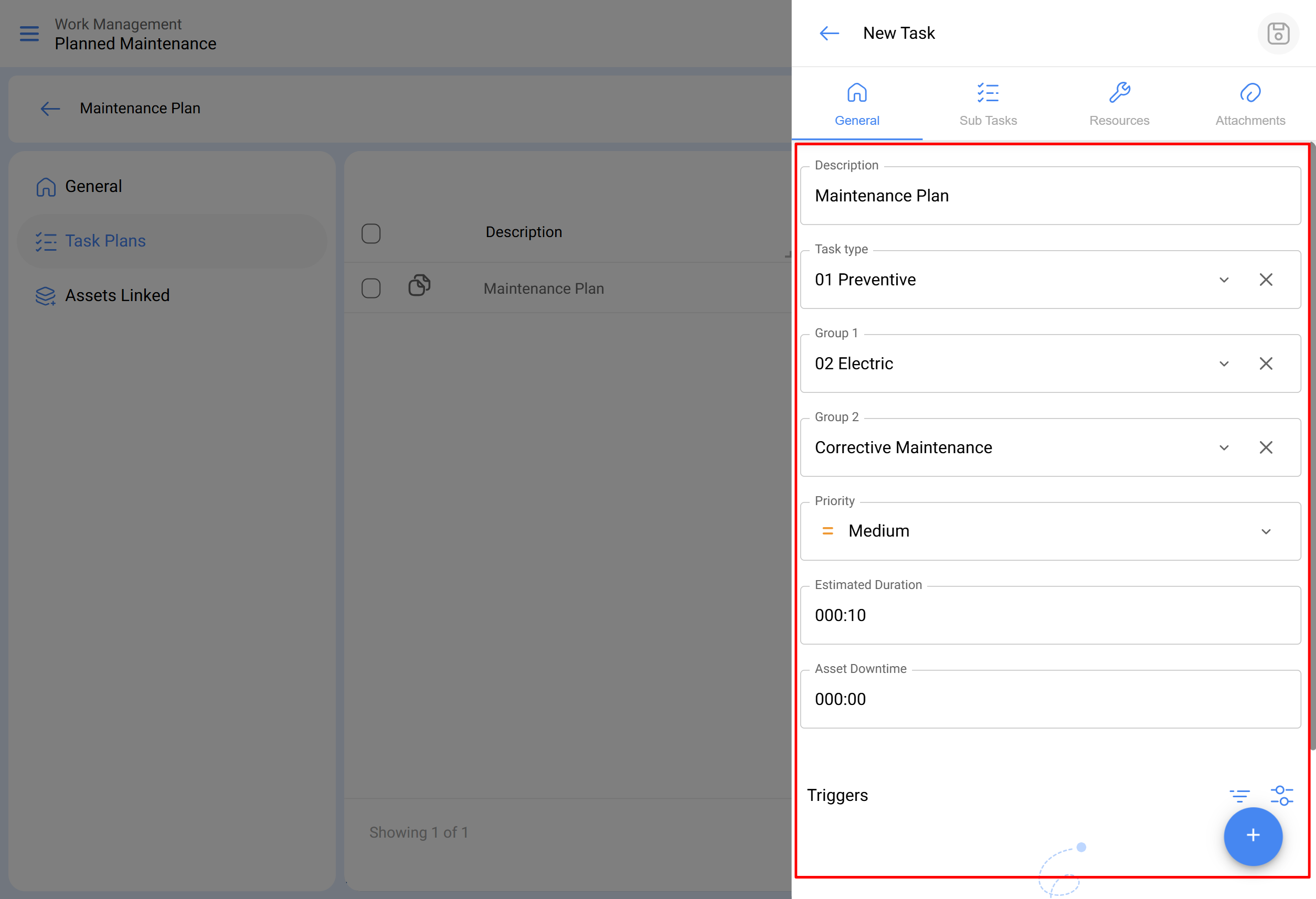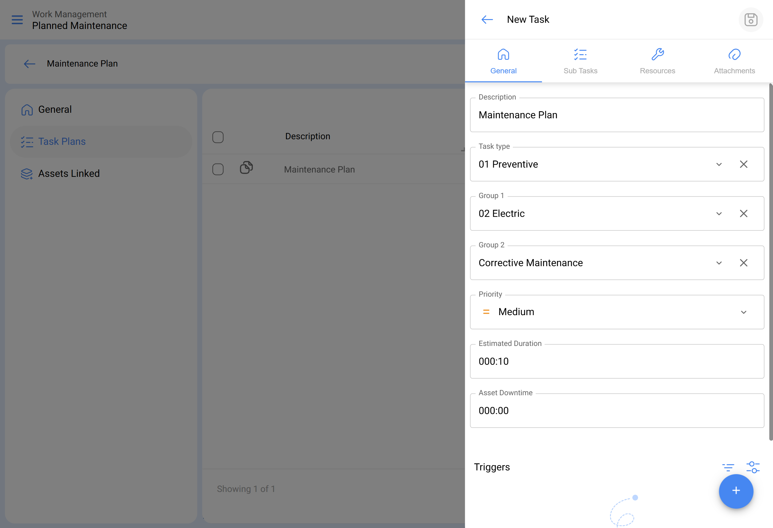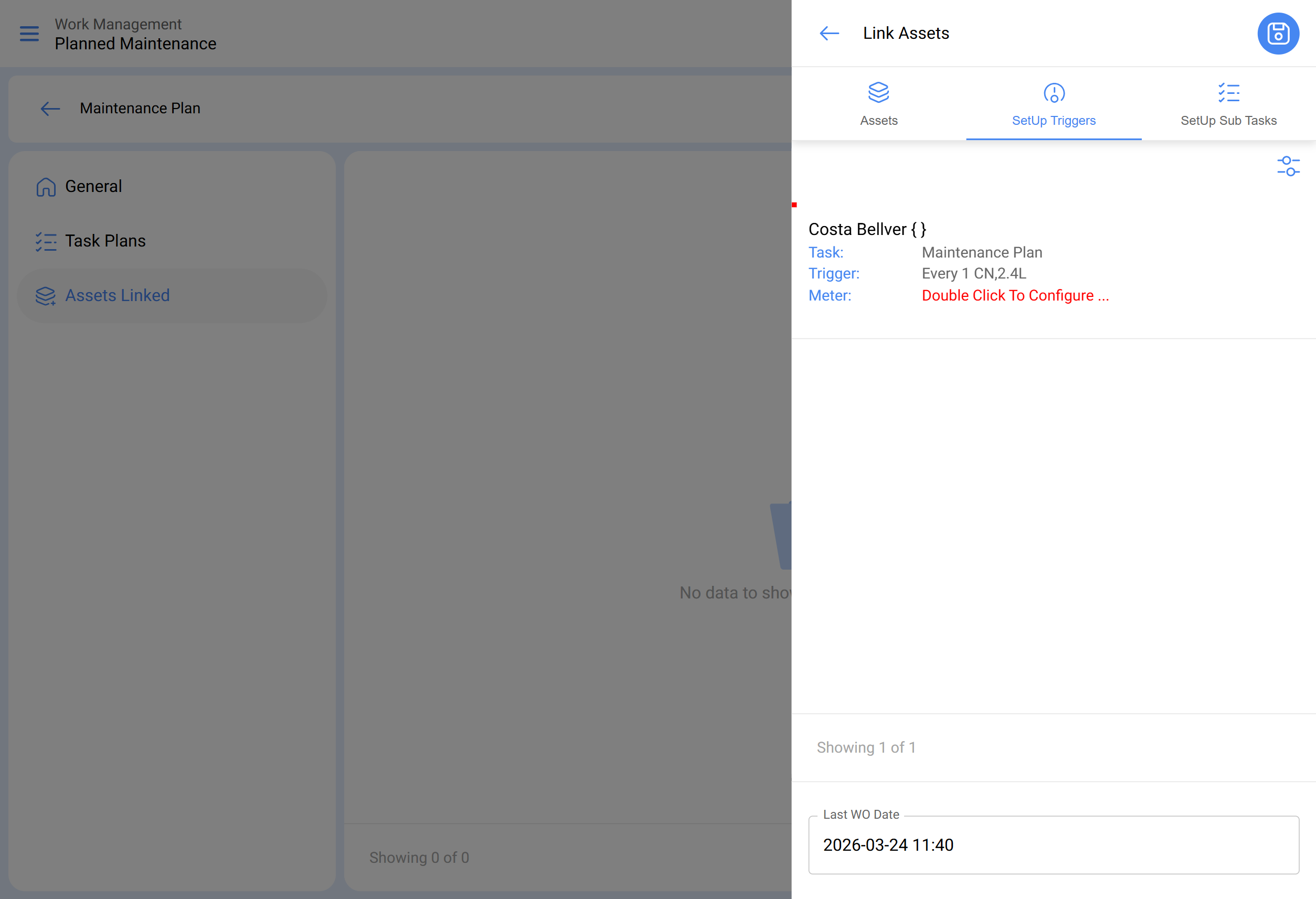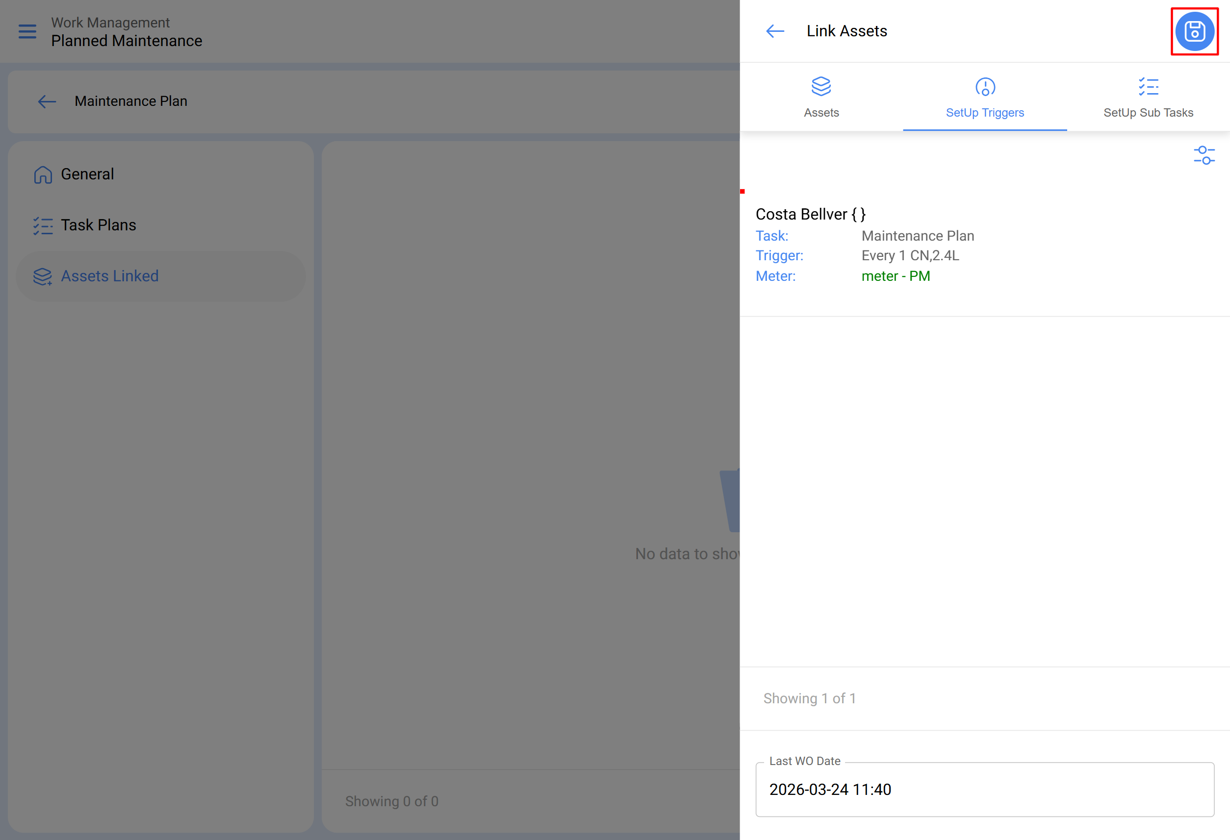 - Une fois que les onglets général, sous-tâches, ressources et pièces jointes sont définis, nous lierons les actifs au plan et associerons le compteur qui déclenchera la tâche.