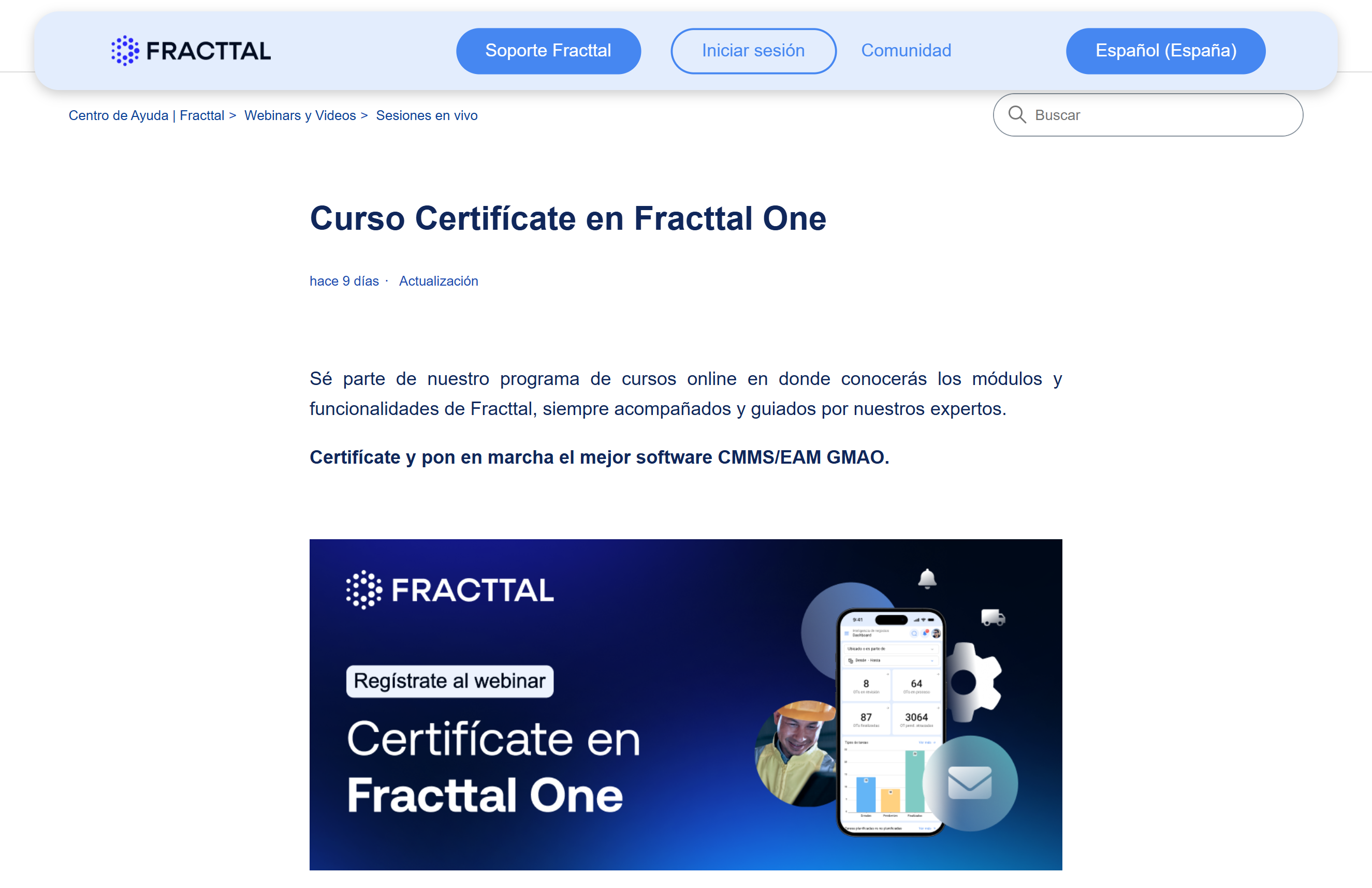 Remarque : Les inscriptions sont annoncées sur nos canaux officiels et sont également communiquées via l'article (Cours Certifiez-vous en Fracttal One) dans le Help Center.