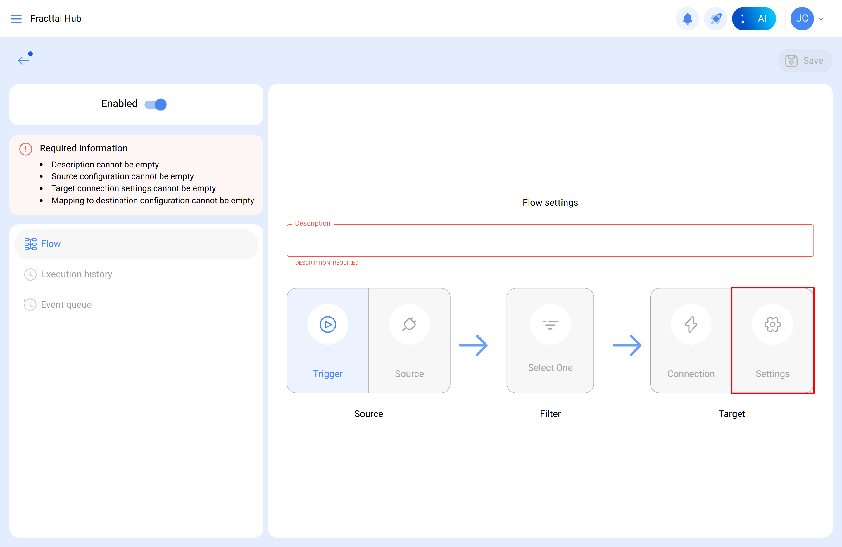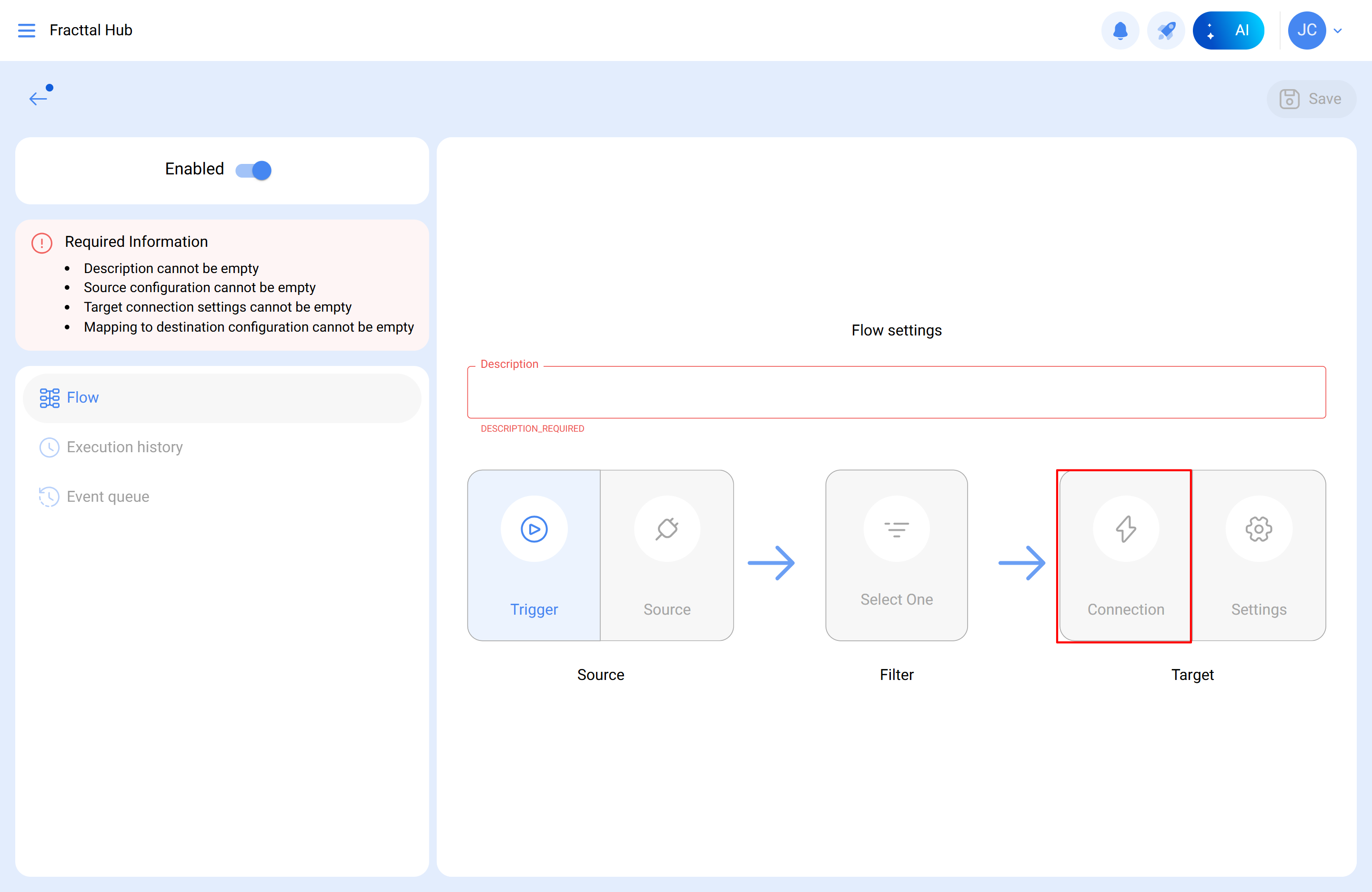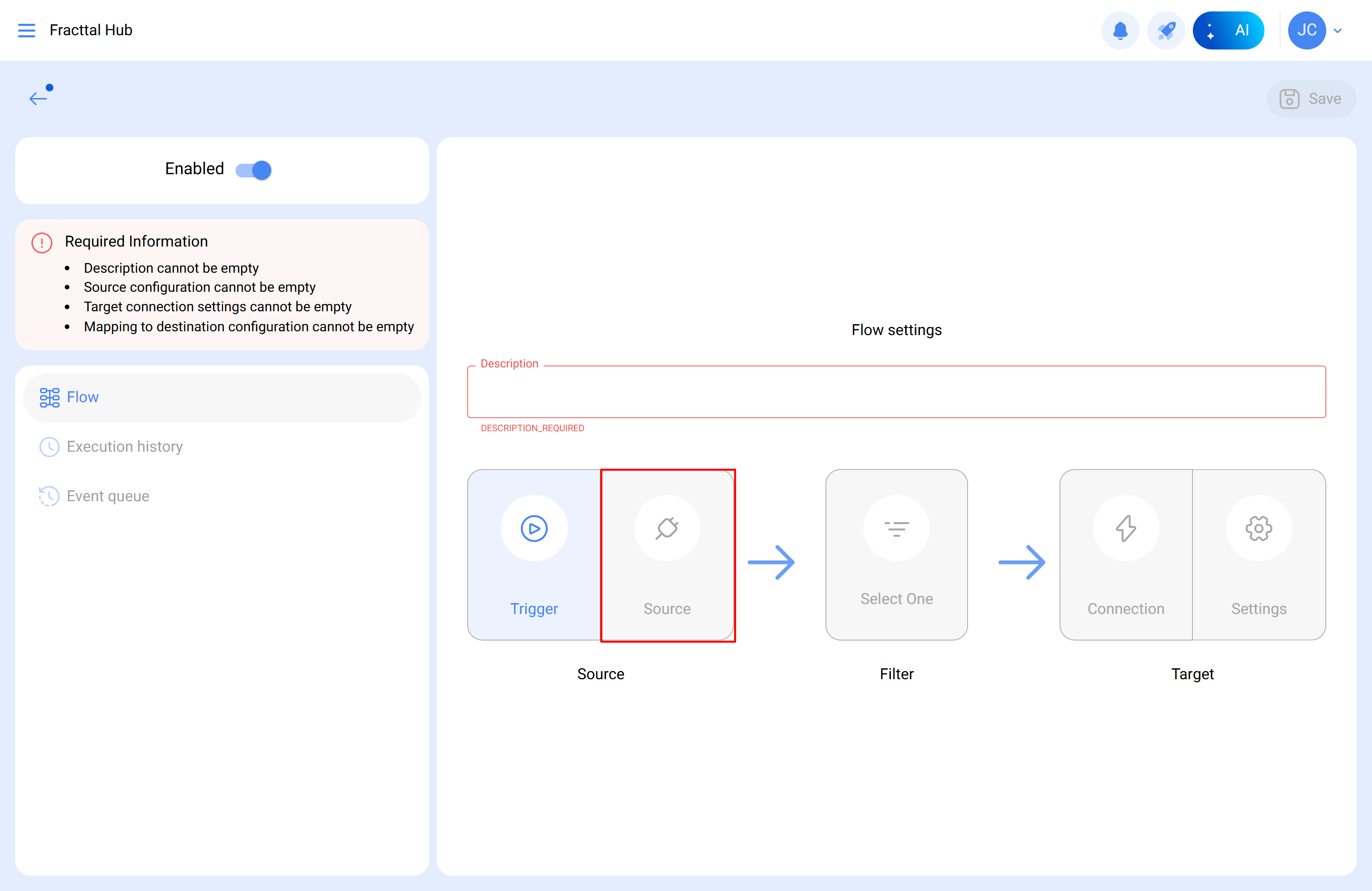 L’écran du flux est divisé en parties : Déclencheur, Source, Connexion et Configuration.