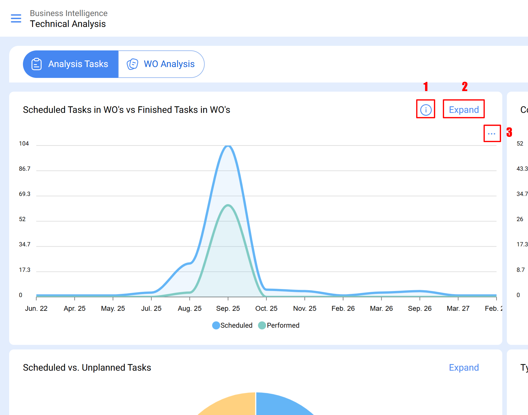 L'Analyse des Tâches présente des graphiques pour évaluer comment les tâches programmées et réalisées sont accomplies, comparer les tâches planifiées avec celles non planifiées, classer les types et examiner les reprogrammations et pauses au sein des ordres de travail. De plus, l'analyse des ordres de travail offre des visualisations qui, à travers une analyse détaillée, aident à comprendre l'évolution dans la création et la clôture des ordres, les motifs d'annulation et la qualité du service, facilitant ainsi la prise de décisions éclairées à moyen et long terme.