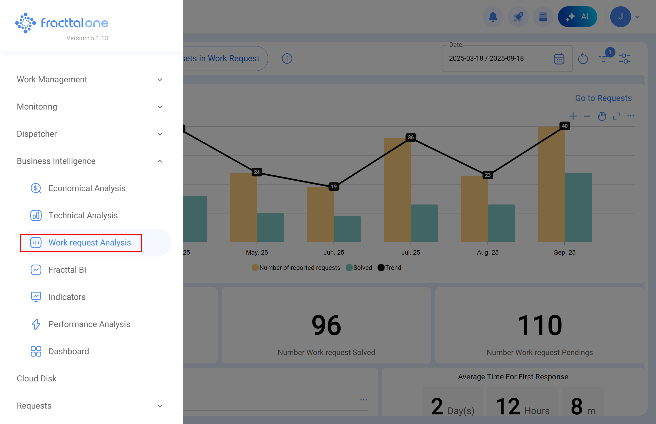 L'Analyse des Demandes permet de surveiller les demandes créées, en cours ou terminées, aidant à comprendre la performance de l'équipe de maintenance en termes de temps de réponse et de qualité de service. Les principales fonctionnalités comprennent :