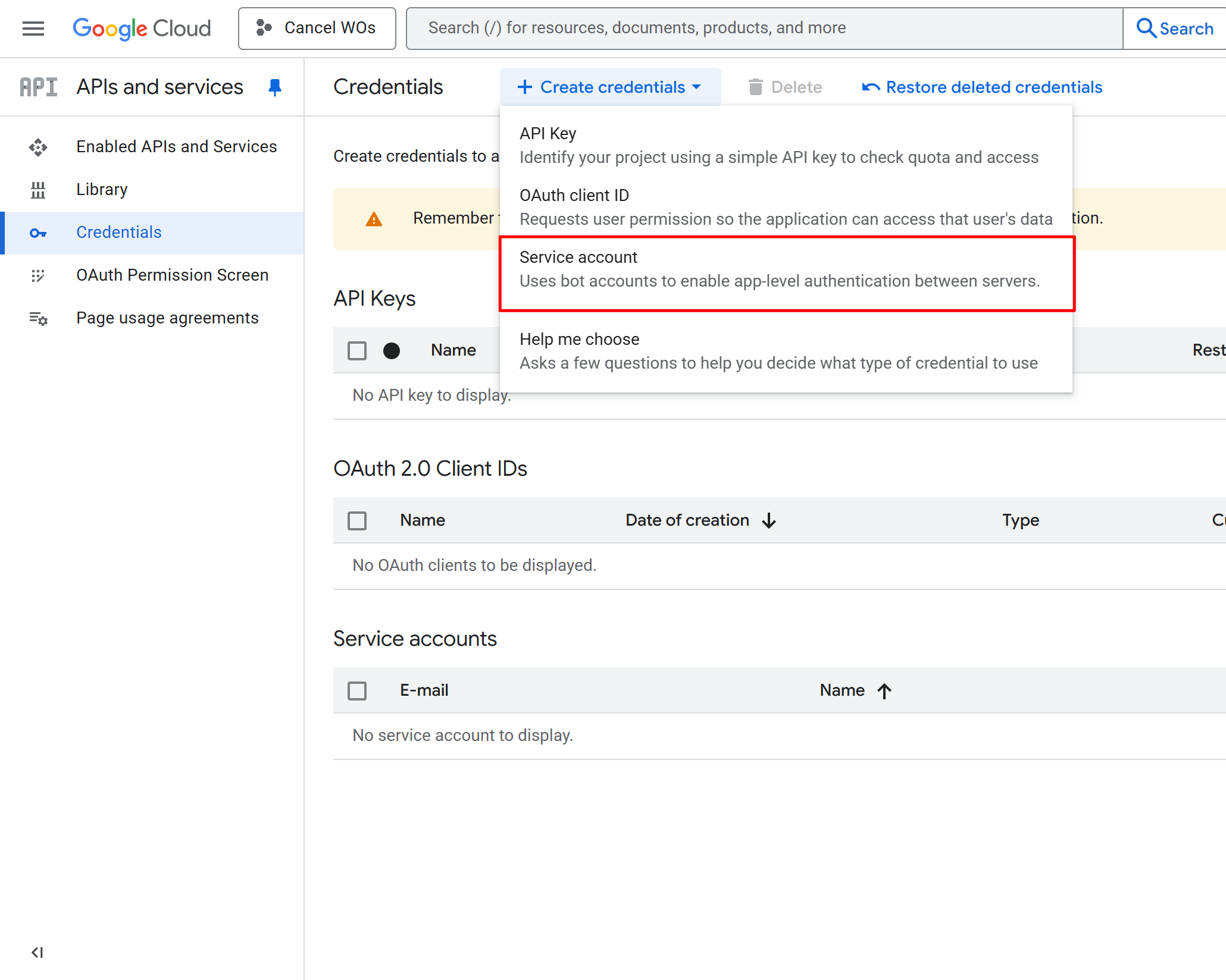 Cliquez sur « + CRÉER DES IDENTIFIANTS » et sélectionnez « Compte de service ».