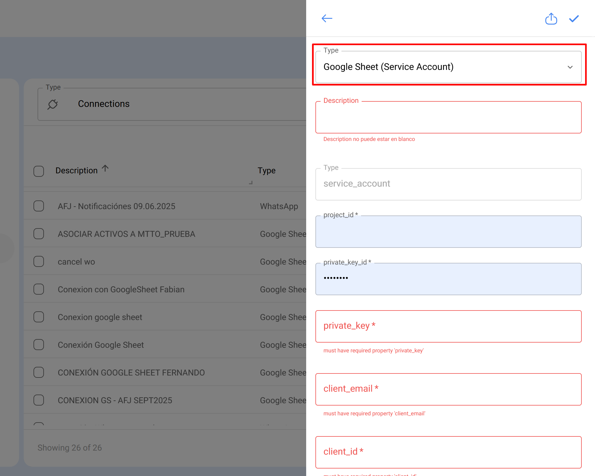 Dans le champ « Type », sélectionnez Google Sheet (Service Account).