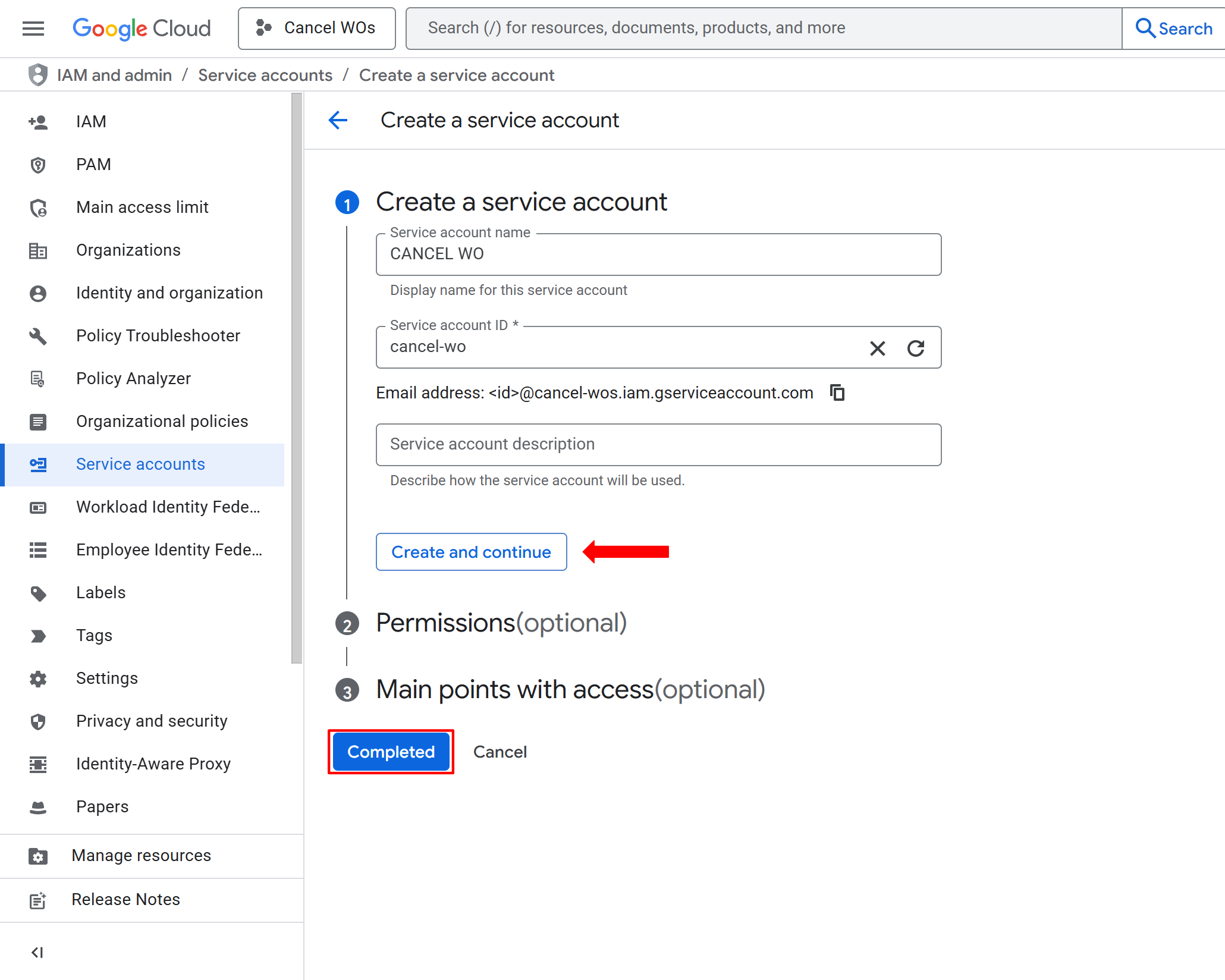 Attribuez un nom au compte de service (par exemple : annuler-ot). L’ID sera généré automatiquement.
