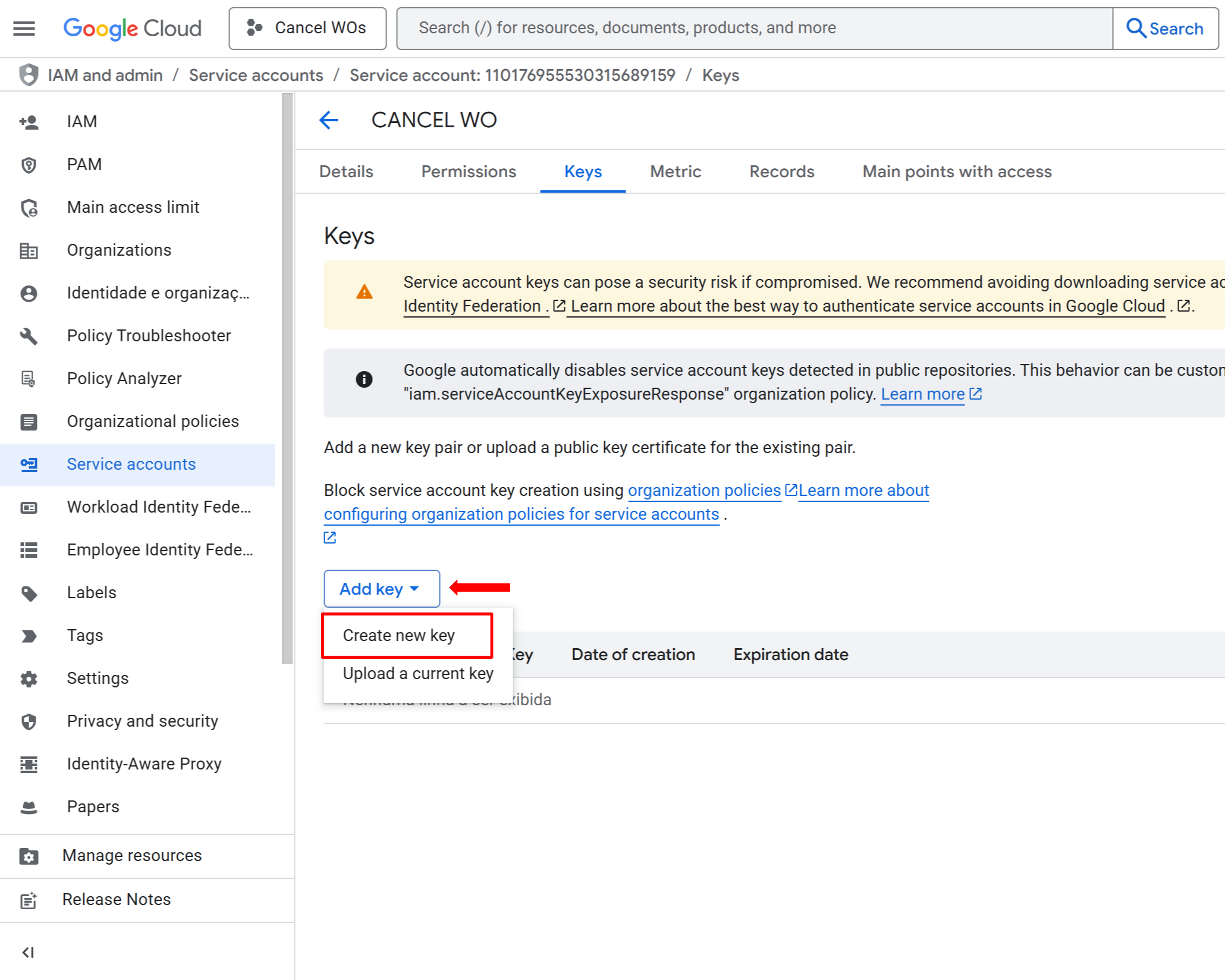 De retour dans la liste des Comptes de service, cliquez sur celui que vous venez de créer et accédez à l’onglet « CLÉS ».