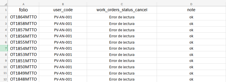 Renseignez les colonnes user_code, work_orders_status_cancel et note pour toutes les lignes concernées. Vous pouvez étendre les valeurs si elles sont identiques pour tous les OT.