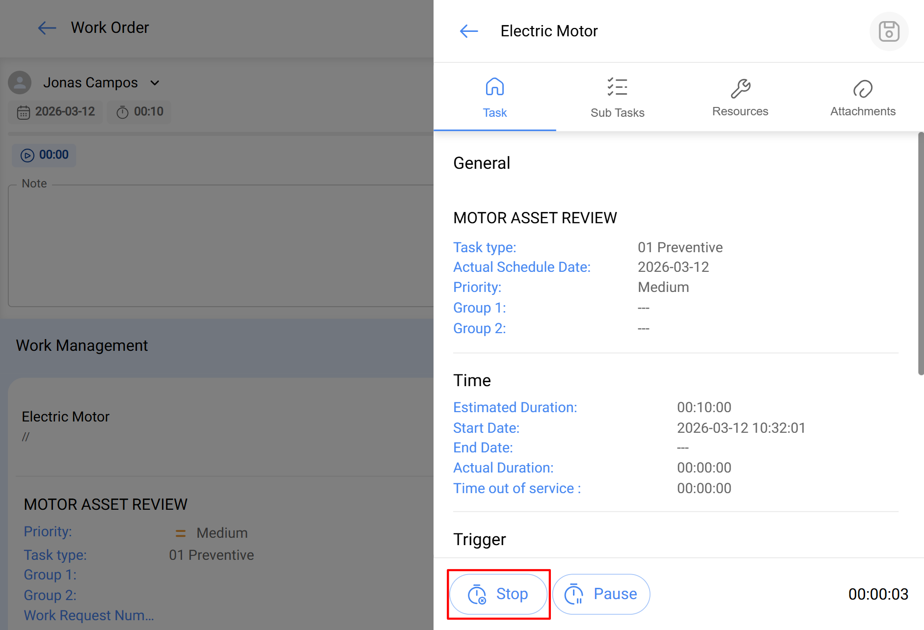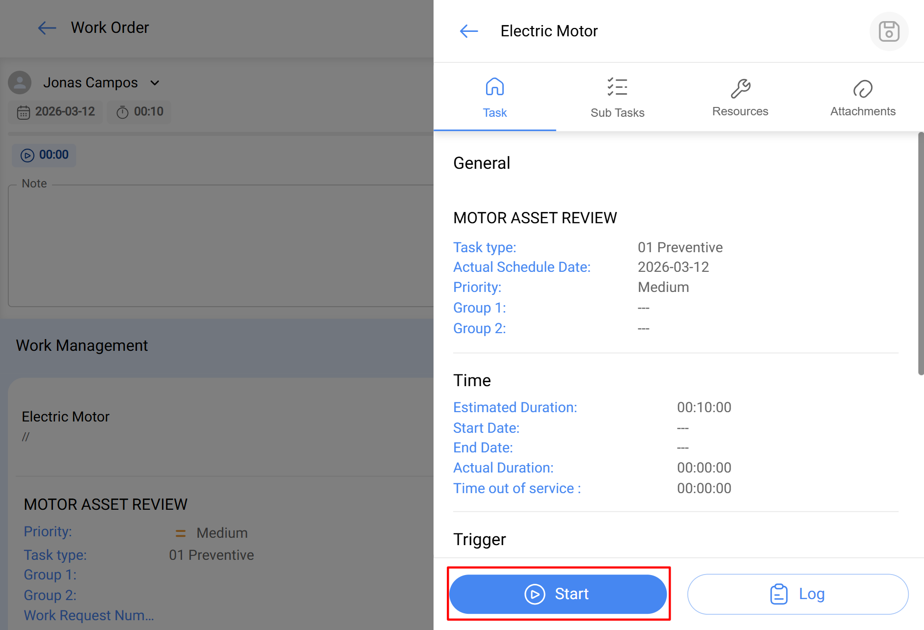 Lorsqu'un technicien commence une tâche d'une OT, il doit cliquer sur « Démarrer » pour lancer l'exécution.