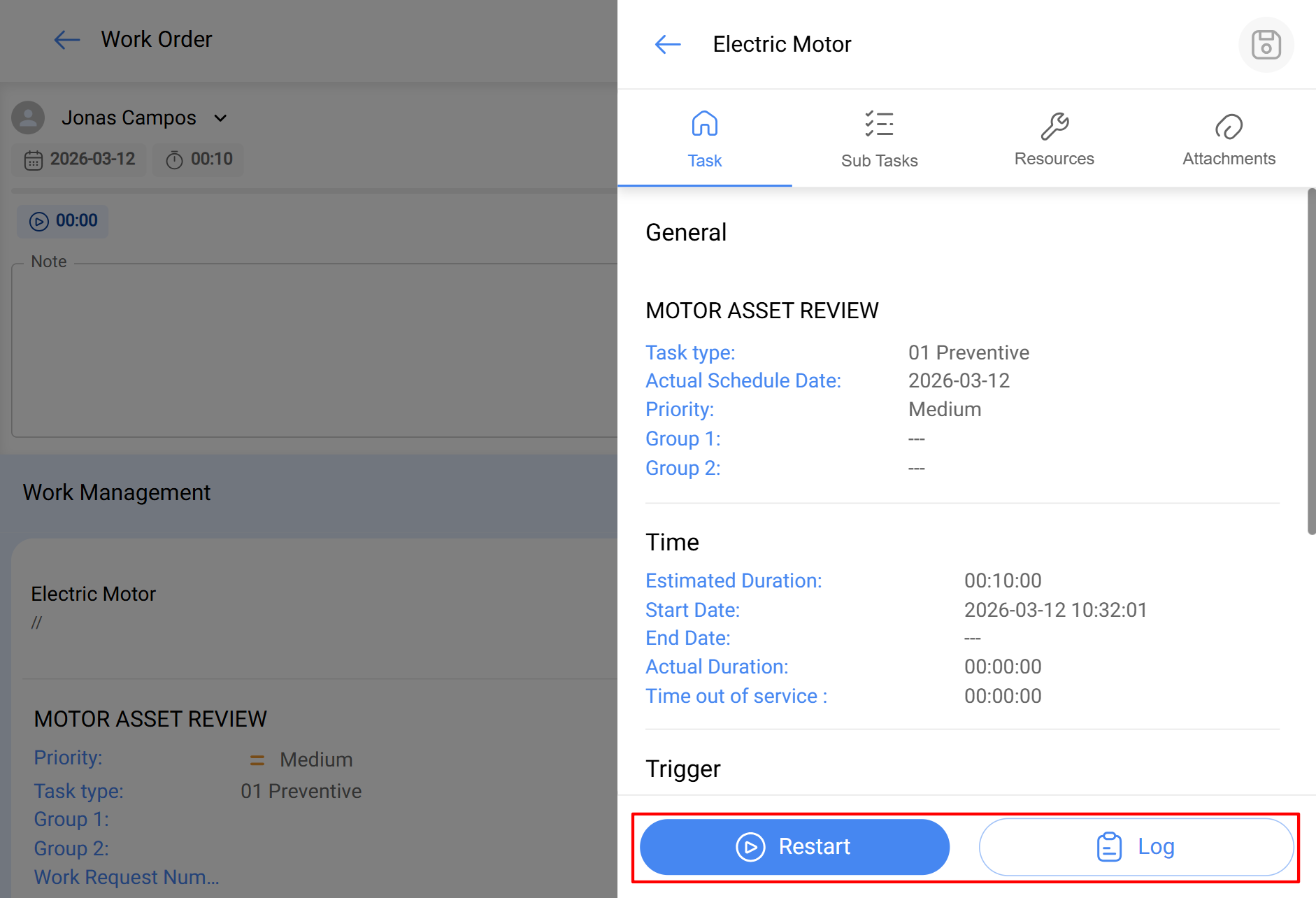 Pour reprendre la tâche après la pause, le technicien doit cliquer sur « Reprendre », et le système enregistrera le temps de pause dans les registres (« Registres »).